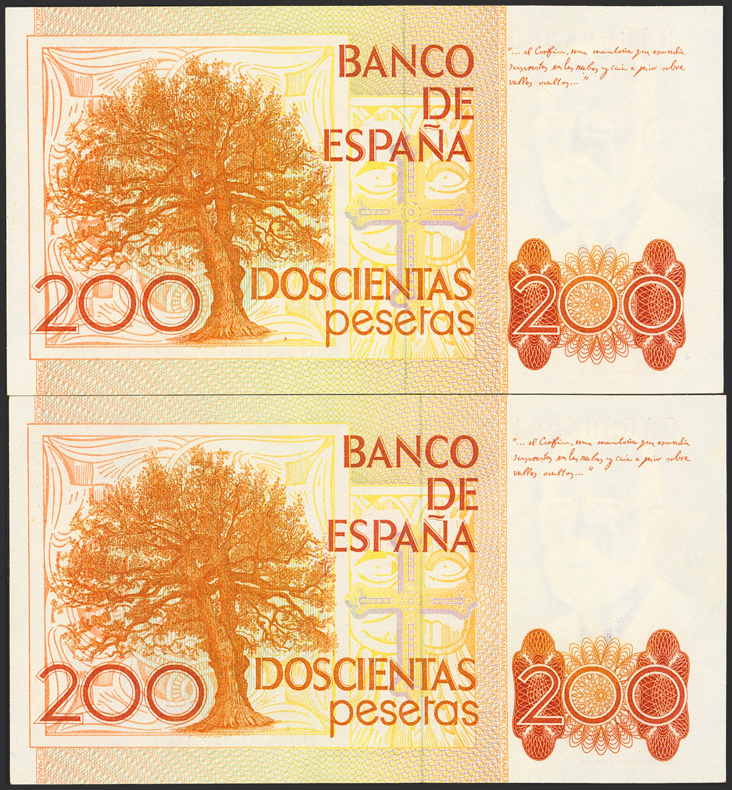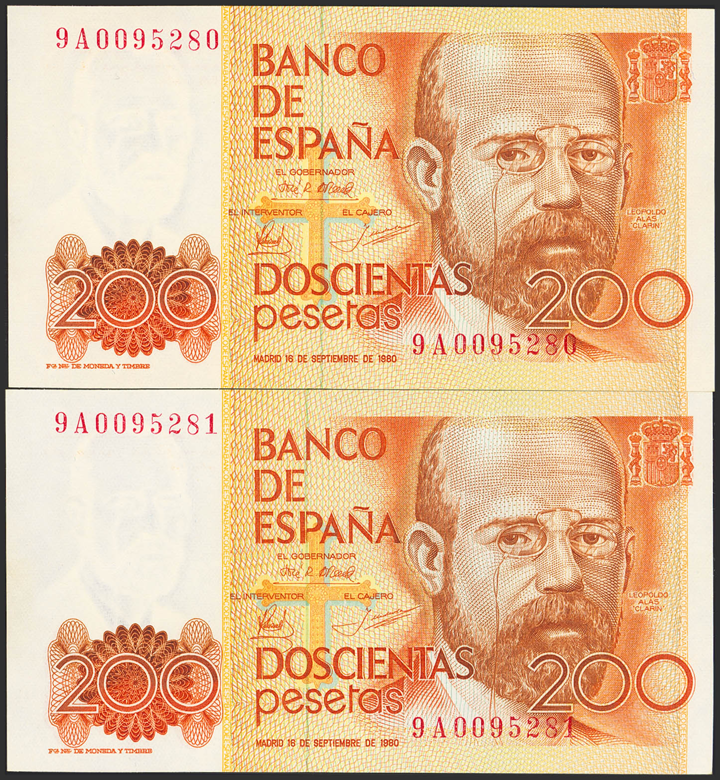 200 Pesetas. 16 de Septiembre de 1980. Pareja correlativa. Serie especial 9A. (Edifil 2023: 480b). SC.
