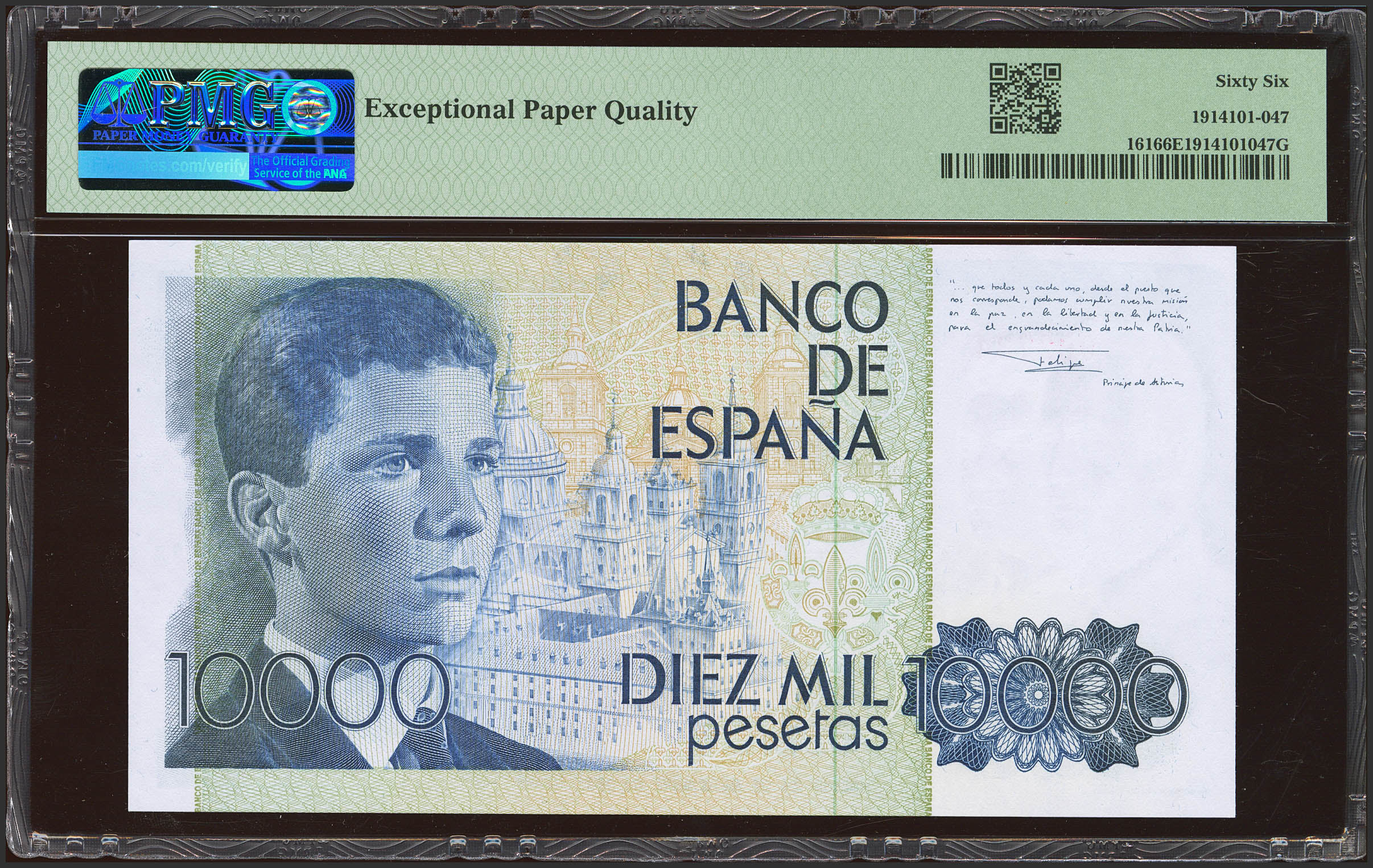 10000 Pesetas. 24 de Septiembre de 1985. Sin serie y bajísima numeración. (Edifil 2023: 481, Pick: 161). Inusual en esta excepcional calidad. SC. Encapsulado PMG66EPQ.