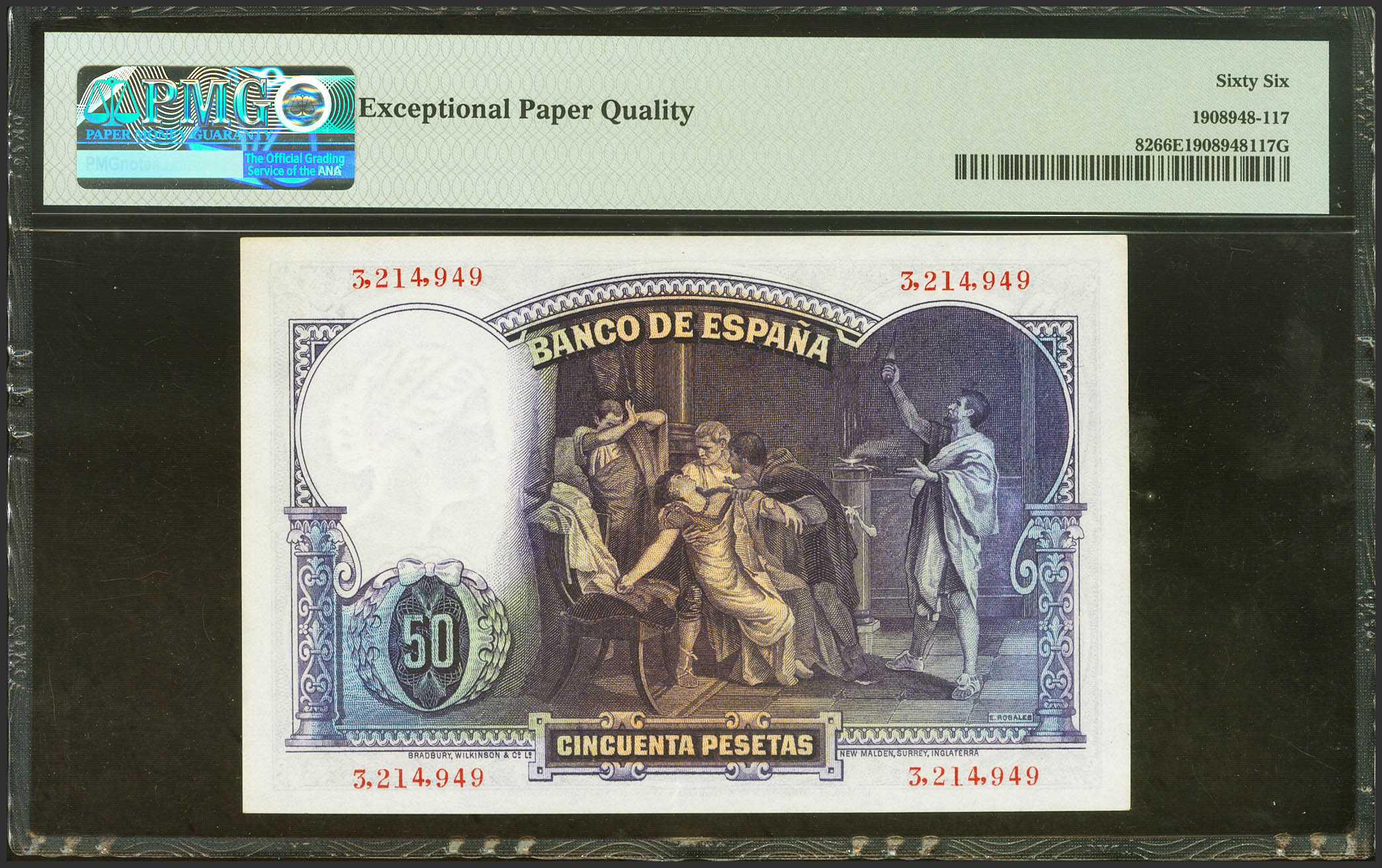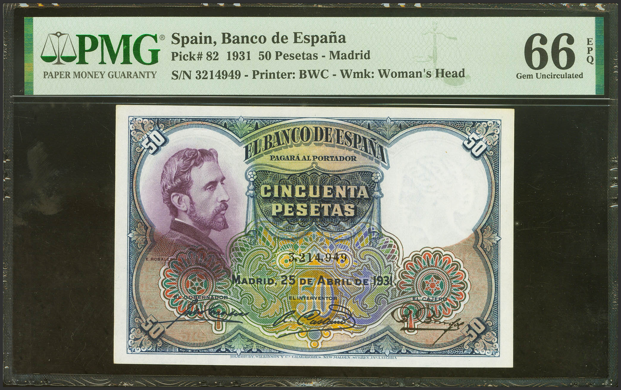 50 Pesetas. 25 de Abril de 1931. Sin serie. (Edifil 2023: 359, Pick: 82). Raro en esta excepcional calidad, apresto original. SC. Encapsulado PMG66EPQ.