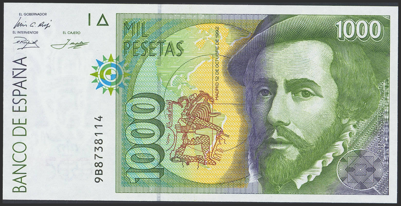 1000 Pesetas. 12 de Octubre de 1992. Serie especial 9B. (Edifil 2021: 483d). Con ondulaciones naturales del proceso de fabricación (este es el único motivo de "quitarle" el SC). EBC+++.