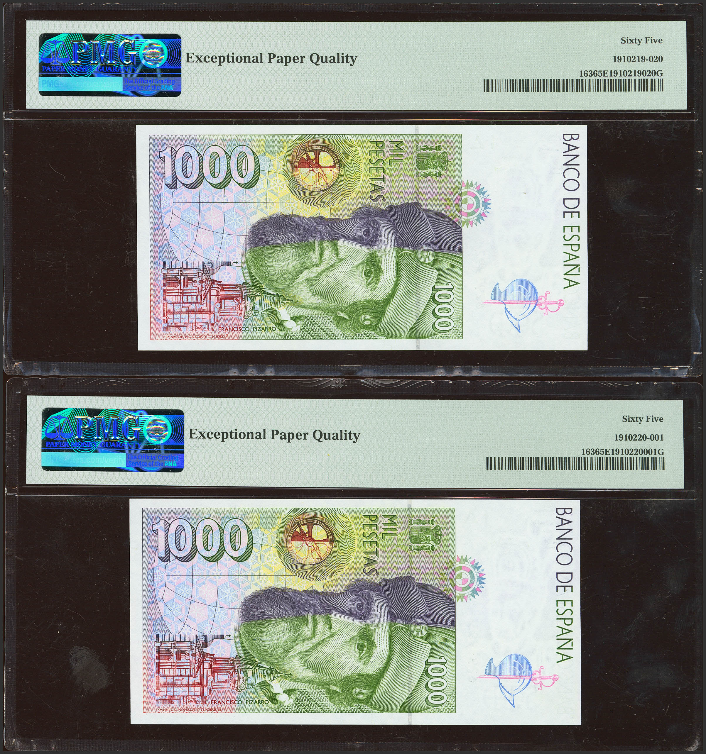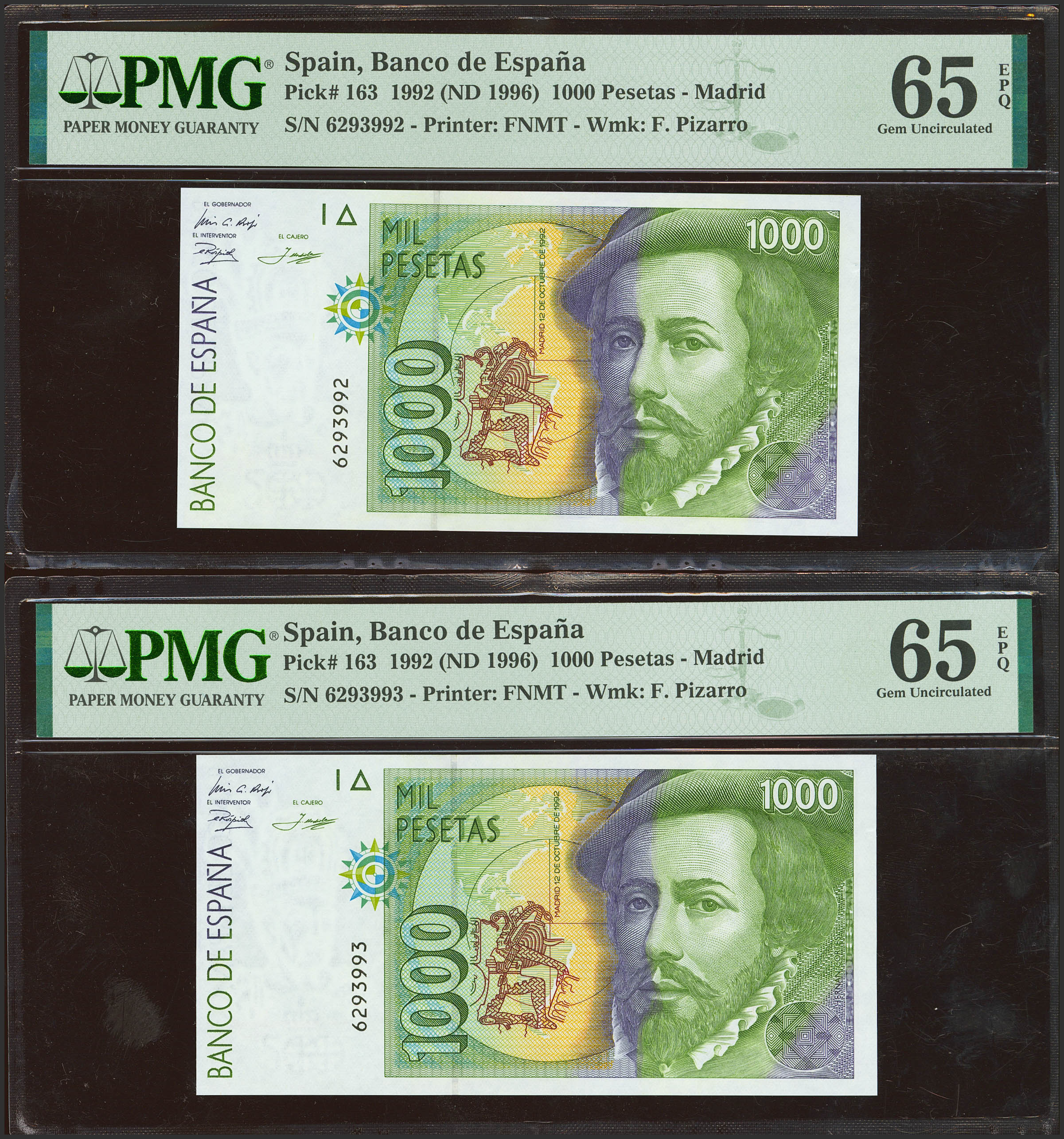 1000 Pesetas. 12 de Octubre de 1992. Pareja correlativa. Sin serie. (Edifil 2023: 483, Pick: 163). SC. Encapsulados PMG65EPQ, ambos.
