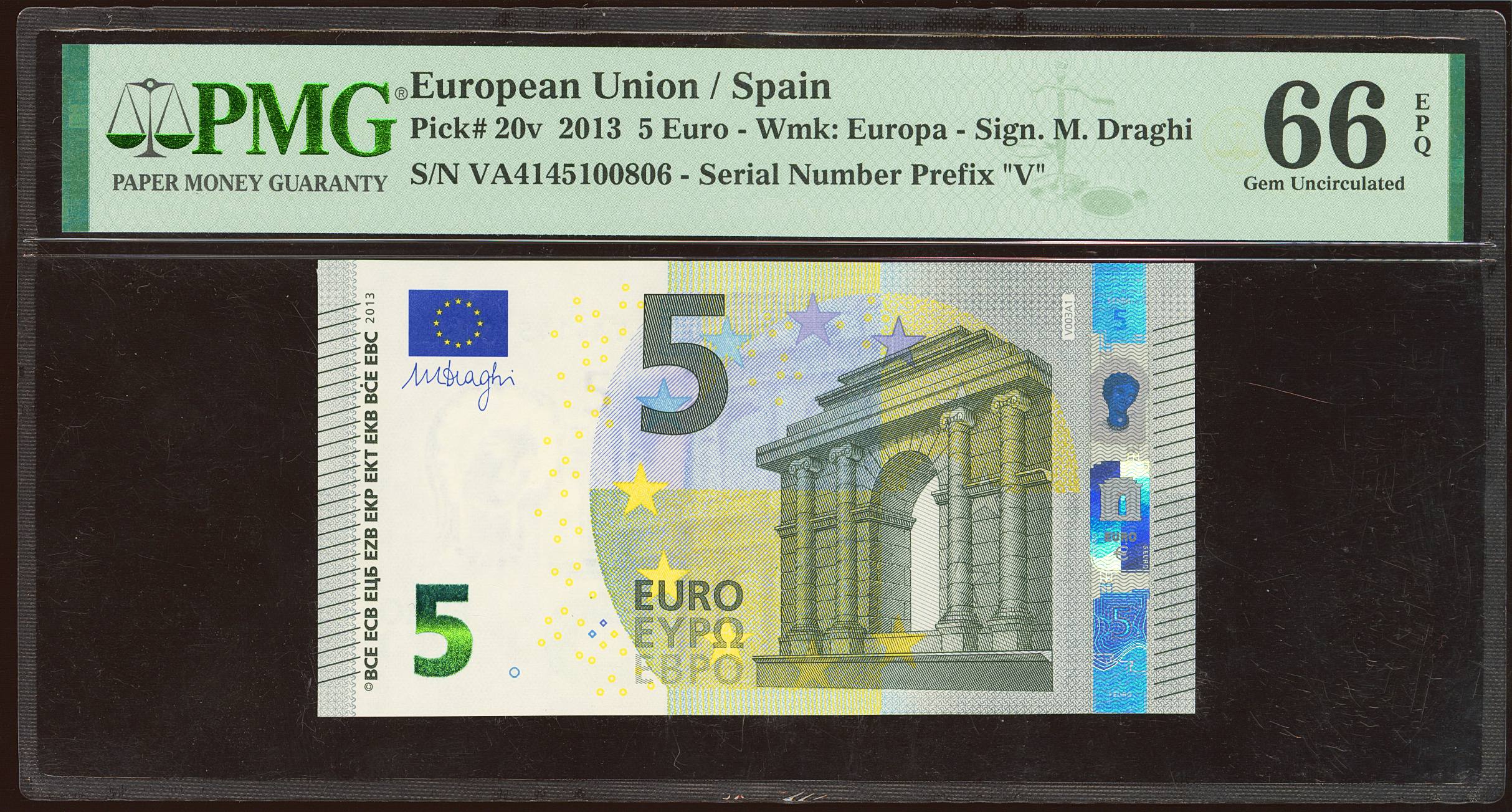 5 Euros. 2 de Mayo de 2013. Firma Draghi. Serie V (España). (Edifil 2023: 493A, Pick: 20v). SC. Encapsulado PMG66EPQ.