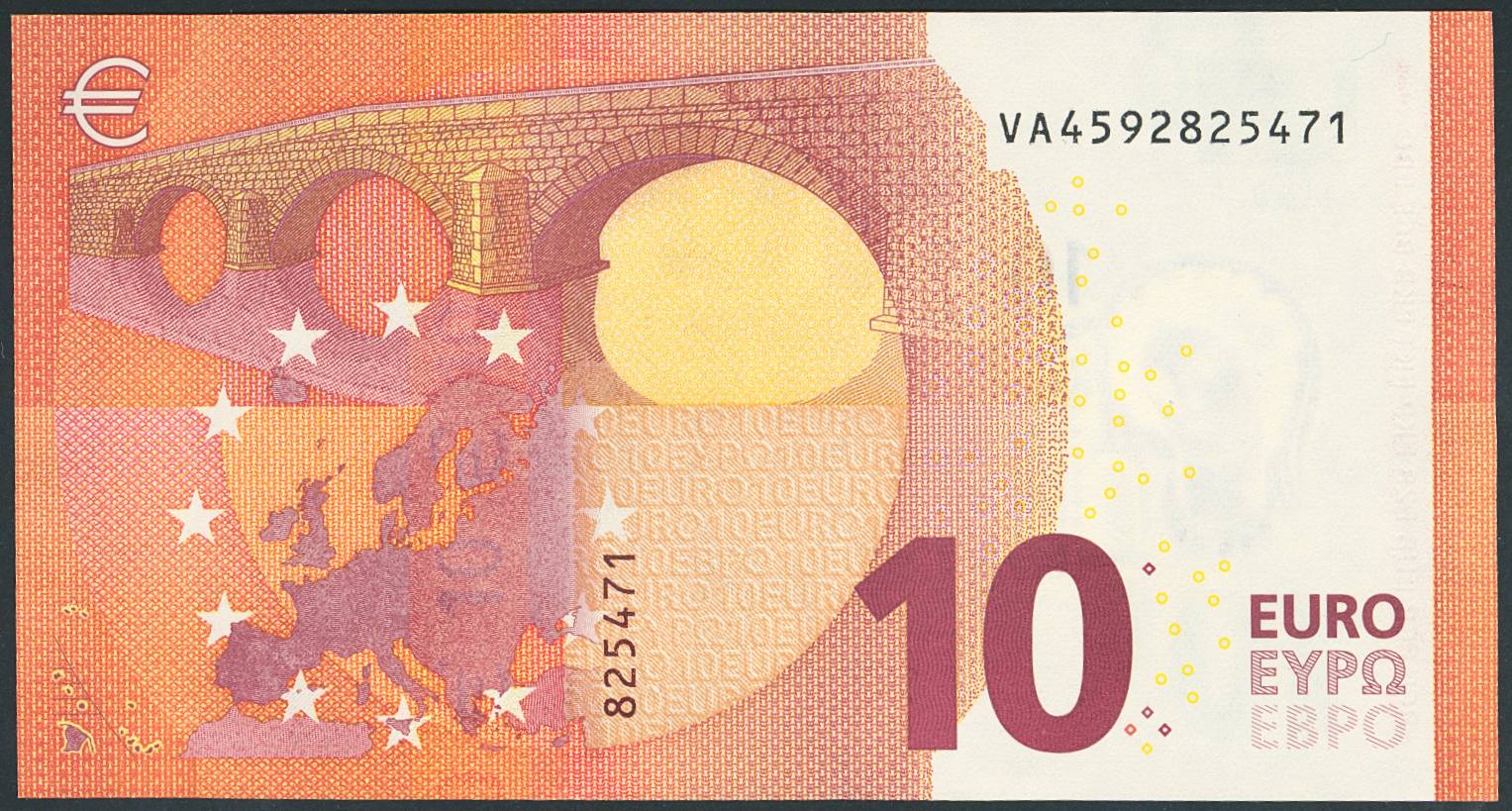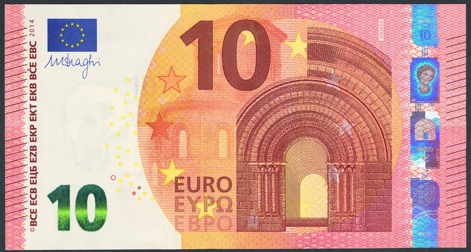 10 Euros. 23 de Septiembre de 2014. Firma Draghi. Serie V (España). (Edifil 2021: 494). Ondulación natural del proceso de fabricación (este es el único motivo de "quitarle" el SC). EBC+++.