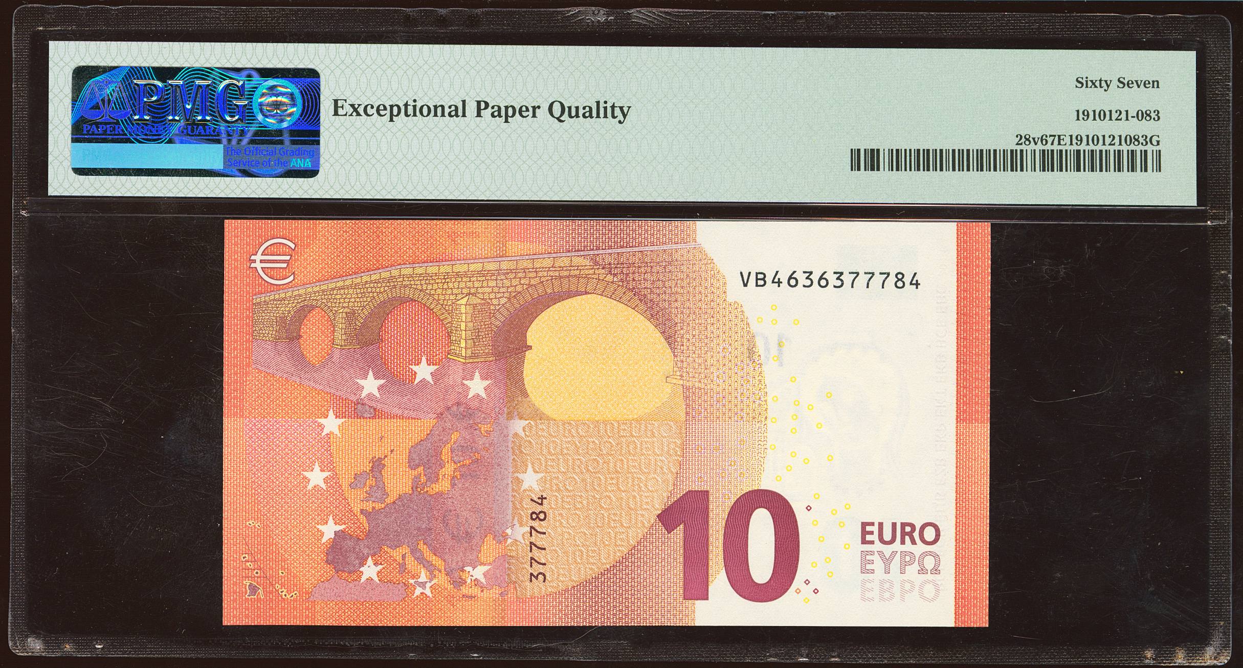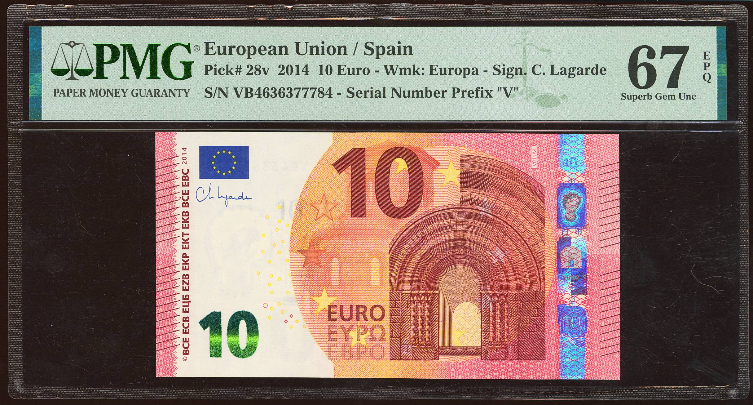 10 Euros. 23 de Septiembre de 2014. Firma Lagarde. Serie V (España). (Edifil 2021: 494A, Pick: 28v). SC. Encapsulado PMG67EPQ.