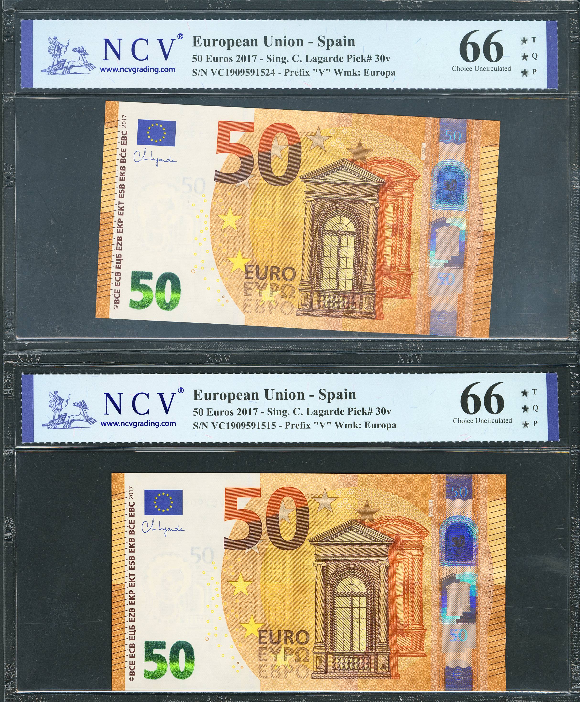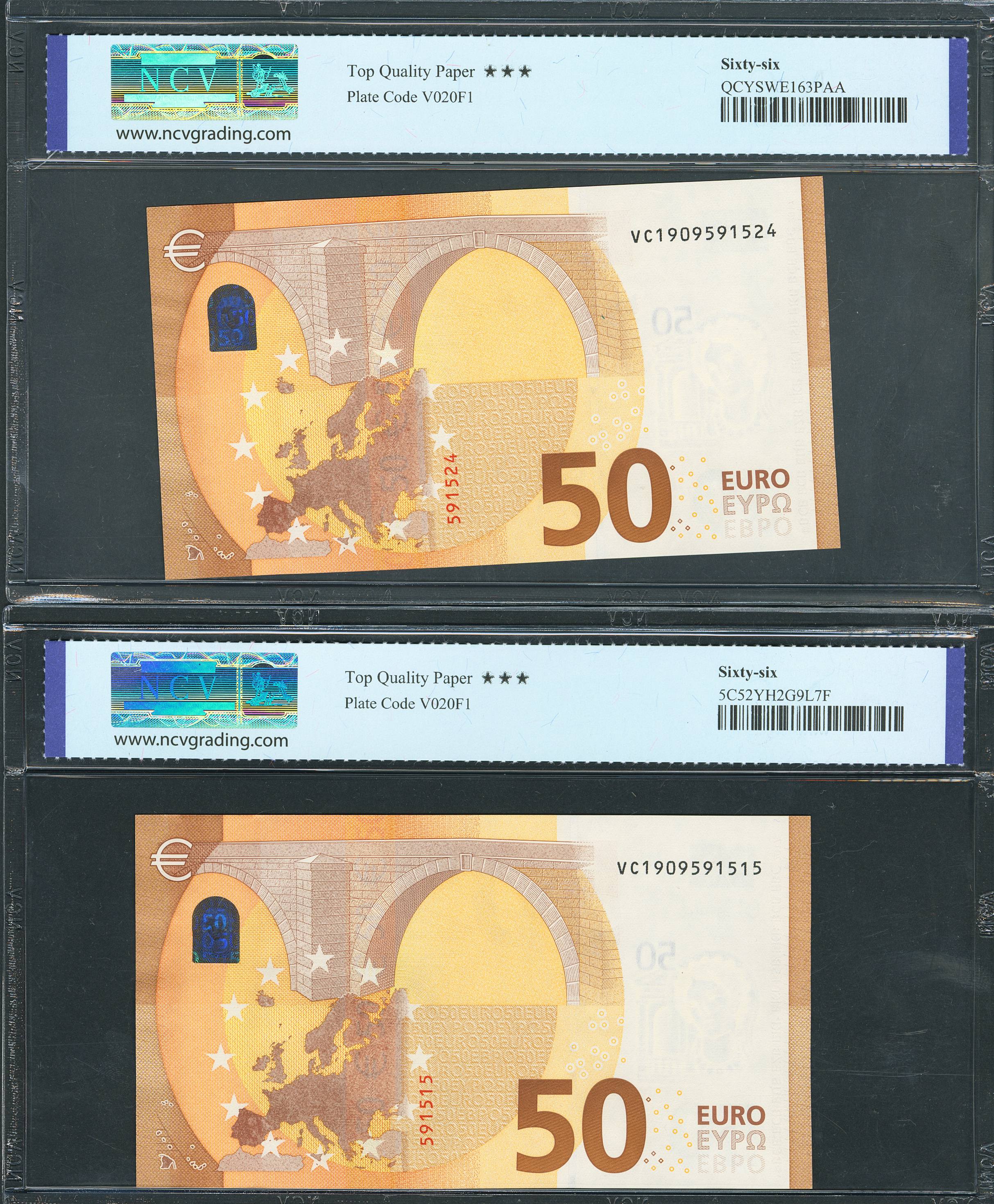 50 Euros. 4 de Abril de 2017. Pareja correlativa (cabe recordar que el último dígito de todos los billetes denominados en euros es para control interno del Banco Central Europeo, el que marca la correlatividad de los billetes es el penúltimo dígito). Firma Lagarde. Serie V (España). (Edifil 2023: 496Aa, Pick: 30v). SC. Encapsulados NCV66TQP, ambos.