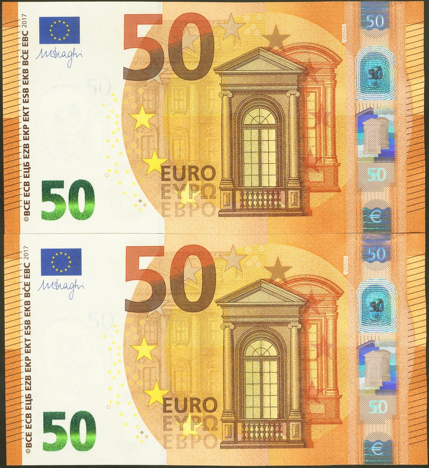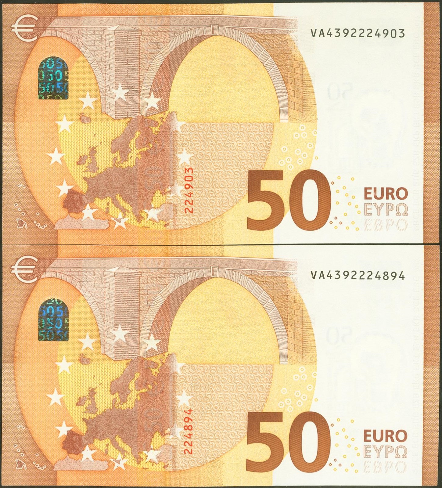 50 Euros. 4 de Abril de 2017. Pareja correlativa (cabe recordar que el último dígito de todos los billetes denominados en euros es para control interno del Banco Central Europeo, el que marca la correlatividad de los billetes es el penúltimo dígito). Firma Draghi. Serie V (España). (Edifil 2021: 496). SC.