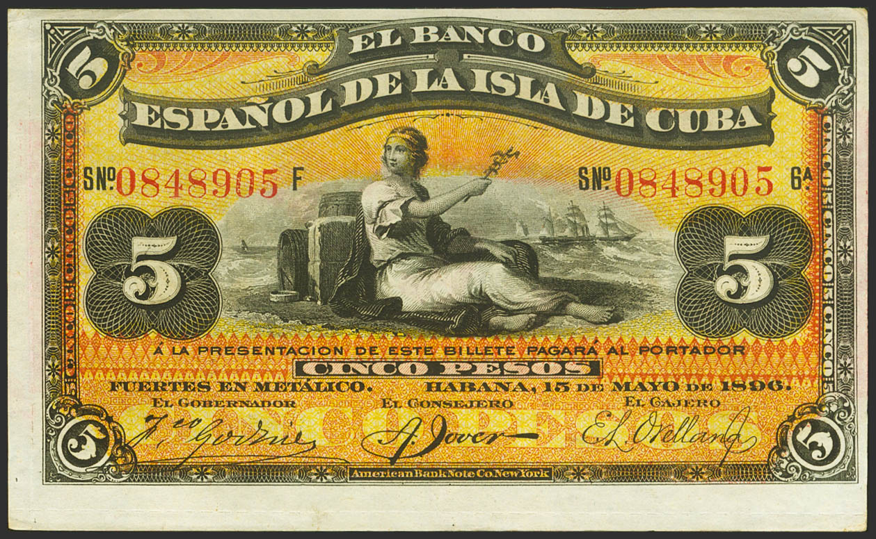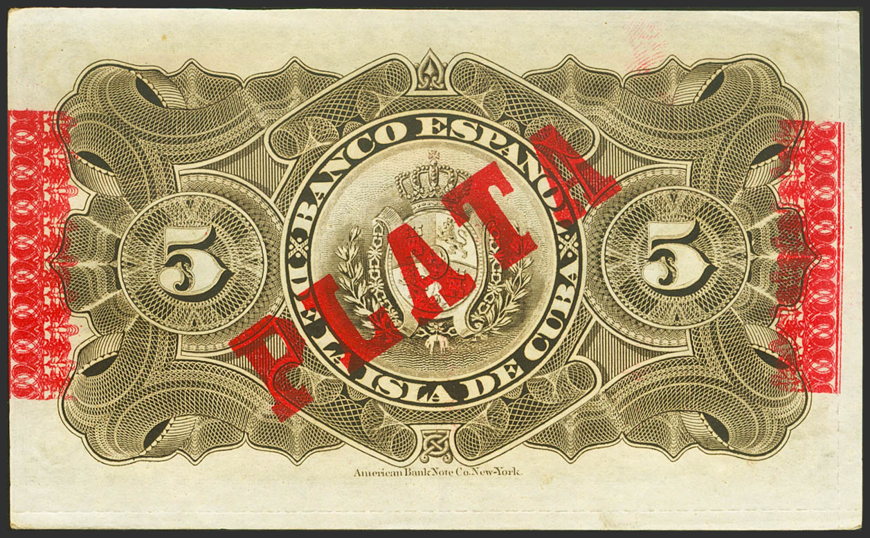 BANCO ESPAÑOL DE LA ISLA DE CUBA. 5 Pesos. 15 de Mayo de 1896. Sobrecarga PLATA, en el reverso. (Edifil 2023: 81). Raro, apresto original. SC-.
