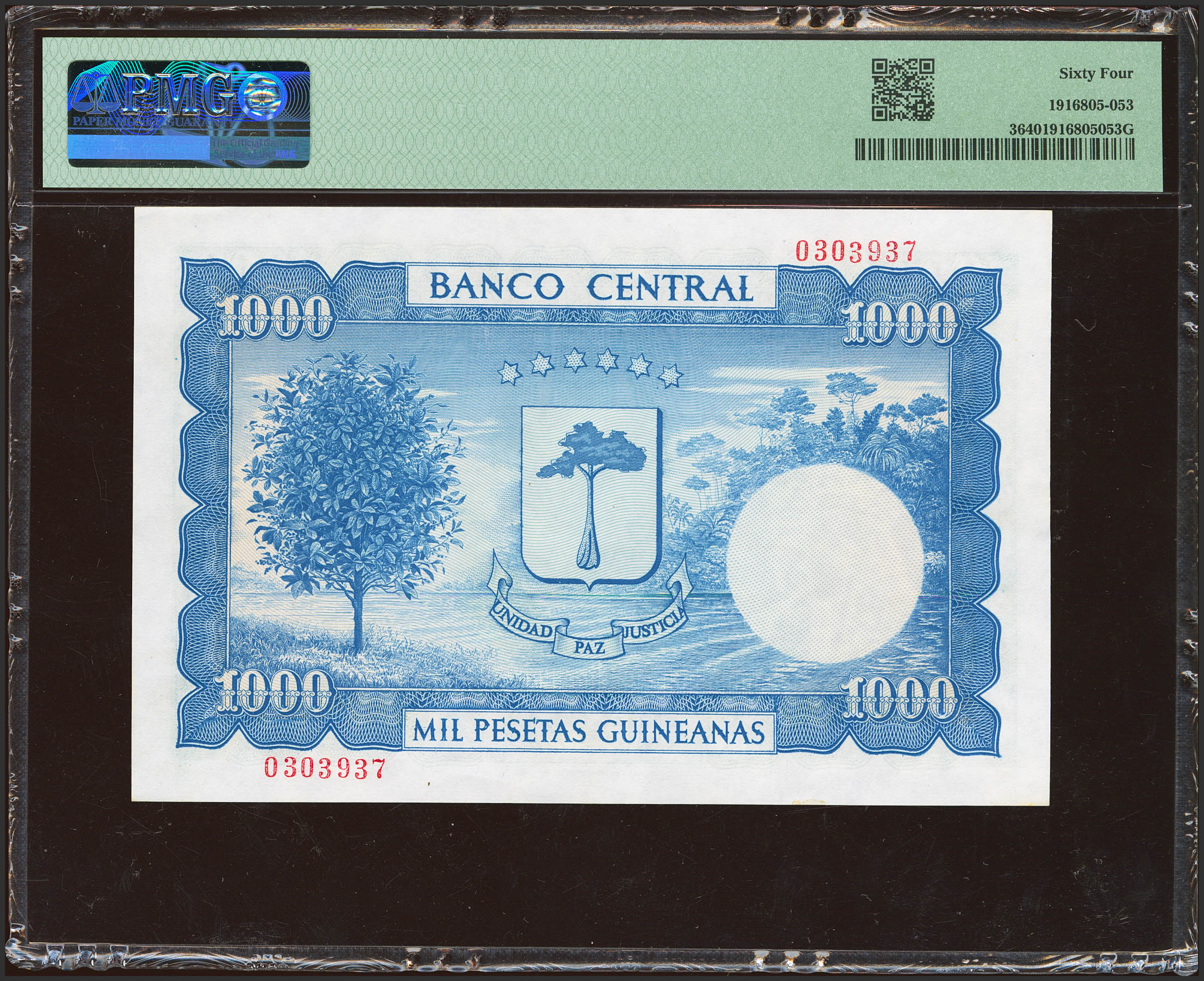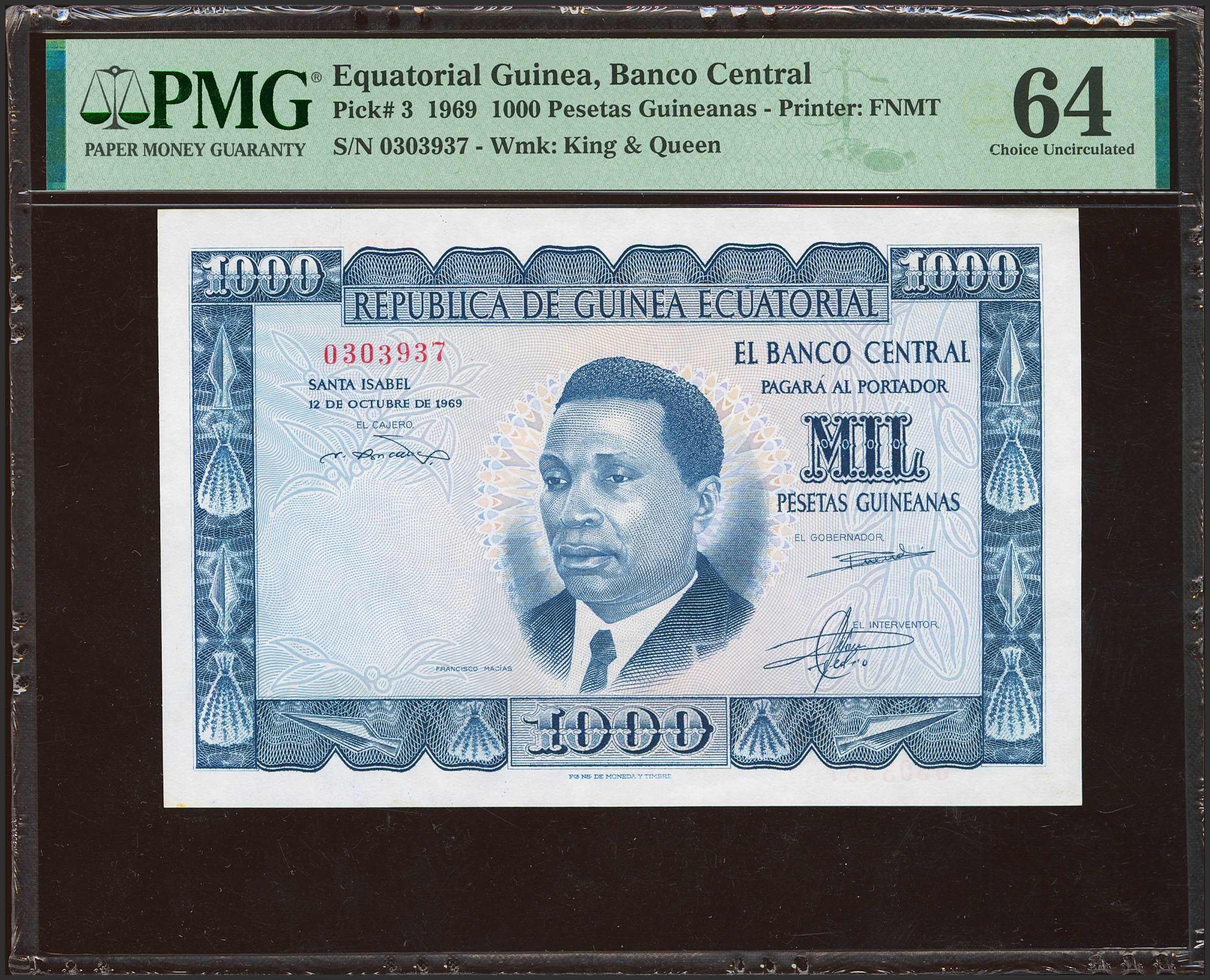 GUINEA ECUATORIAL. 1000 Pesetas. 12 de Octubre de 1969. Sin serie. (Pick: 3). SC. Encapsulado PMG64.