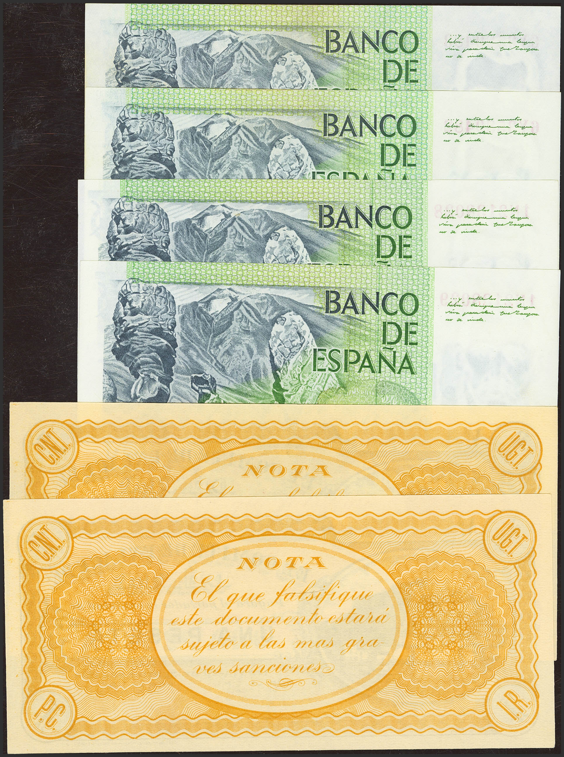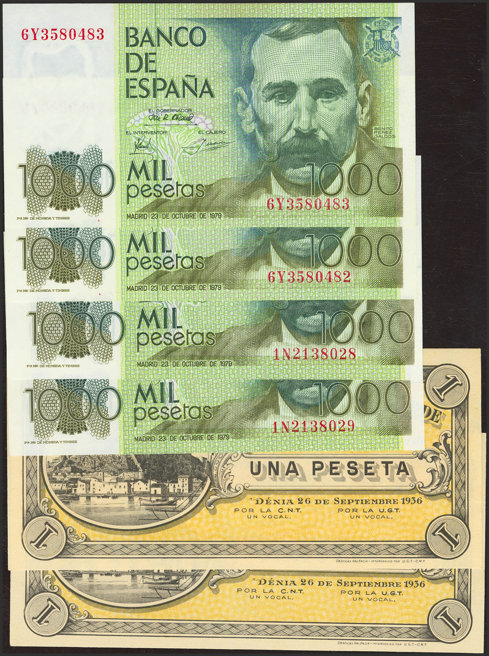 Conjunto de 4 billetes de 1000 Pesetas emitidos el 23 de Octubre de 1979 correspondientes a 2 parejas correlativas, además 2 billetes de la Guerra Civil de la localidad de Denia. A EXAMINAR.