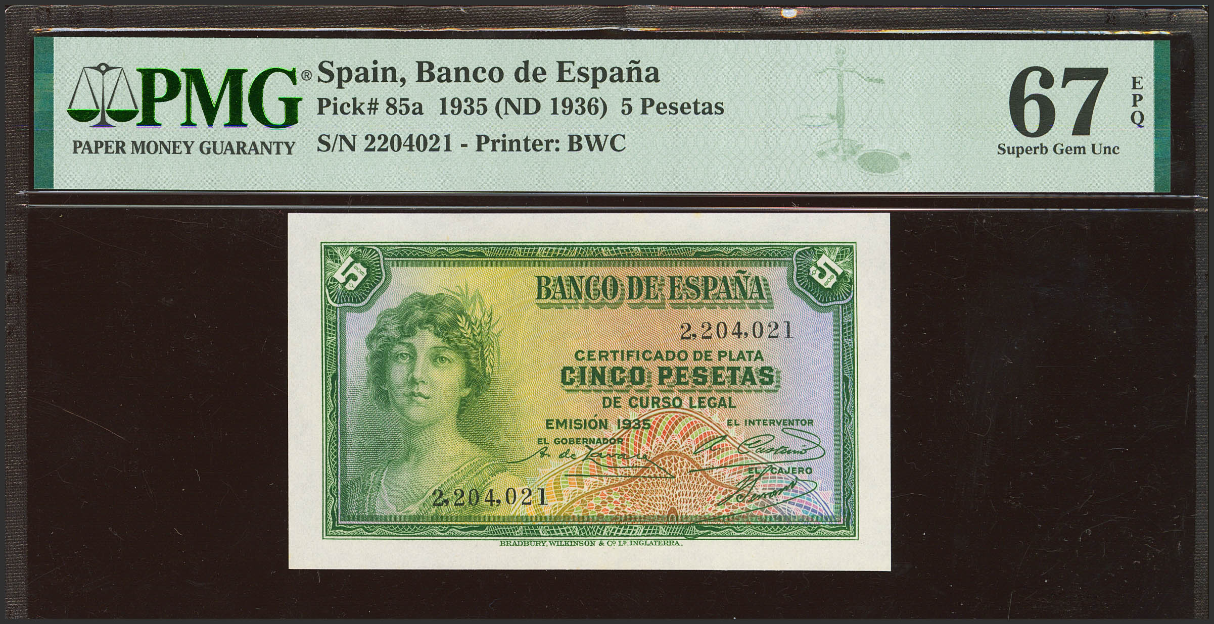 5 Pesetas. 1935. Certificado de Plata. Sin serie. (Edifil 2023: 363, Pick: 85a). Inusual en esta excepcional calidad, apresto original. SC. Encapsulado PMG67EPQ.