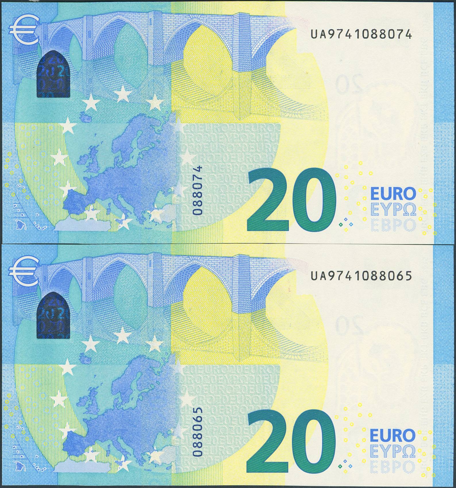 20 Euros. 25 November 2015. Consecutive pair (it should be recalled that the last digit of all euro banknotes is for internal control by the European Central Bank, the penultimate digit is the one that marks the correlativity of the banknotes). Draghi signature. Serial U (France) (Edifil 2021: 495). Uncirculated.