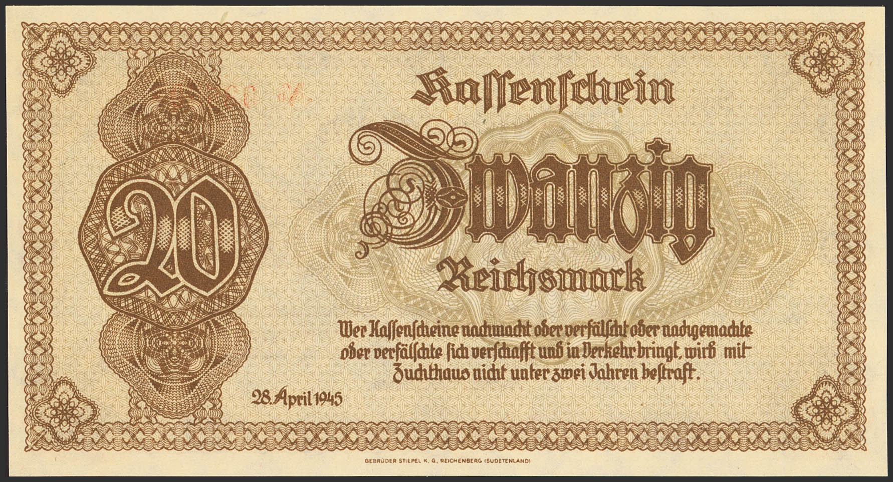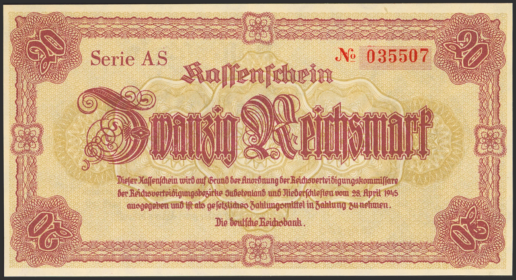 GERMANY. 20 Marks. 1945. Serial AS. (Pick: 187). Uncirculated.