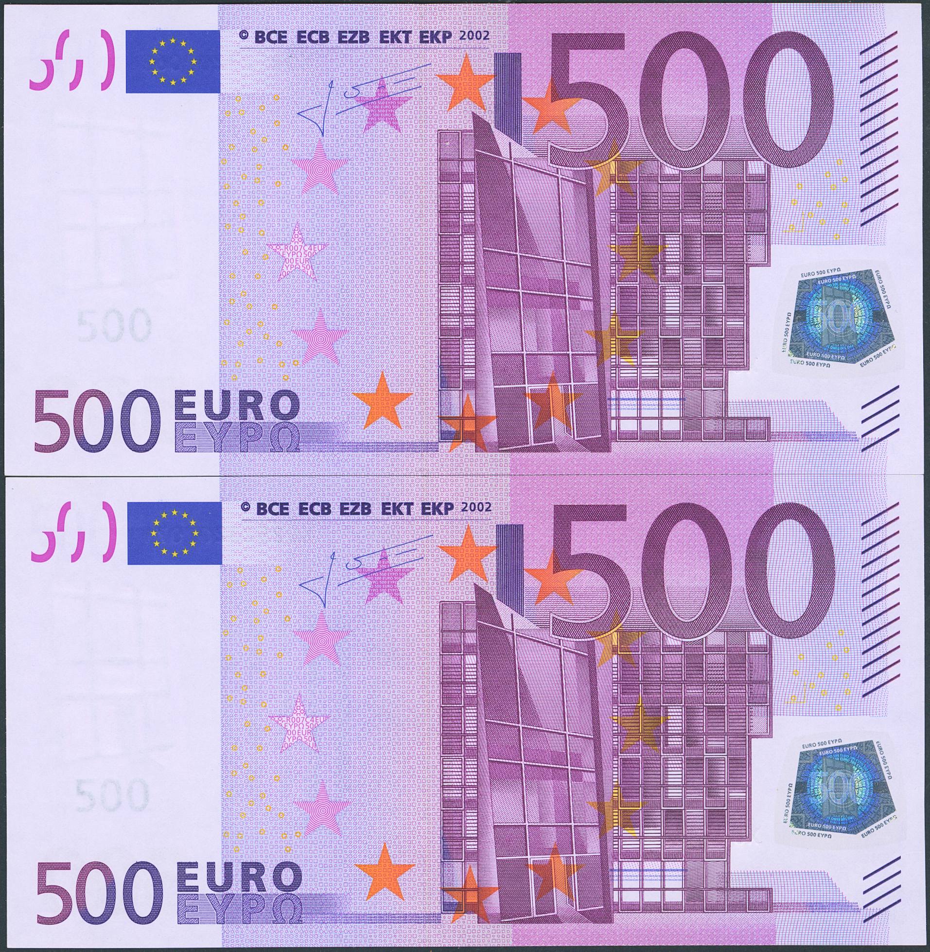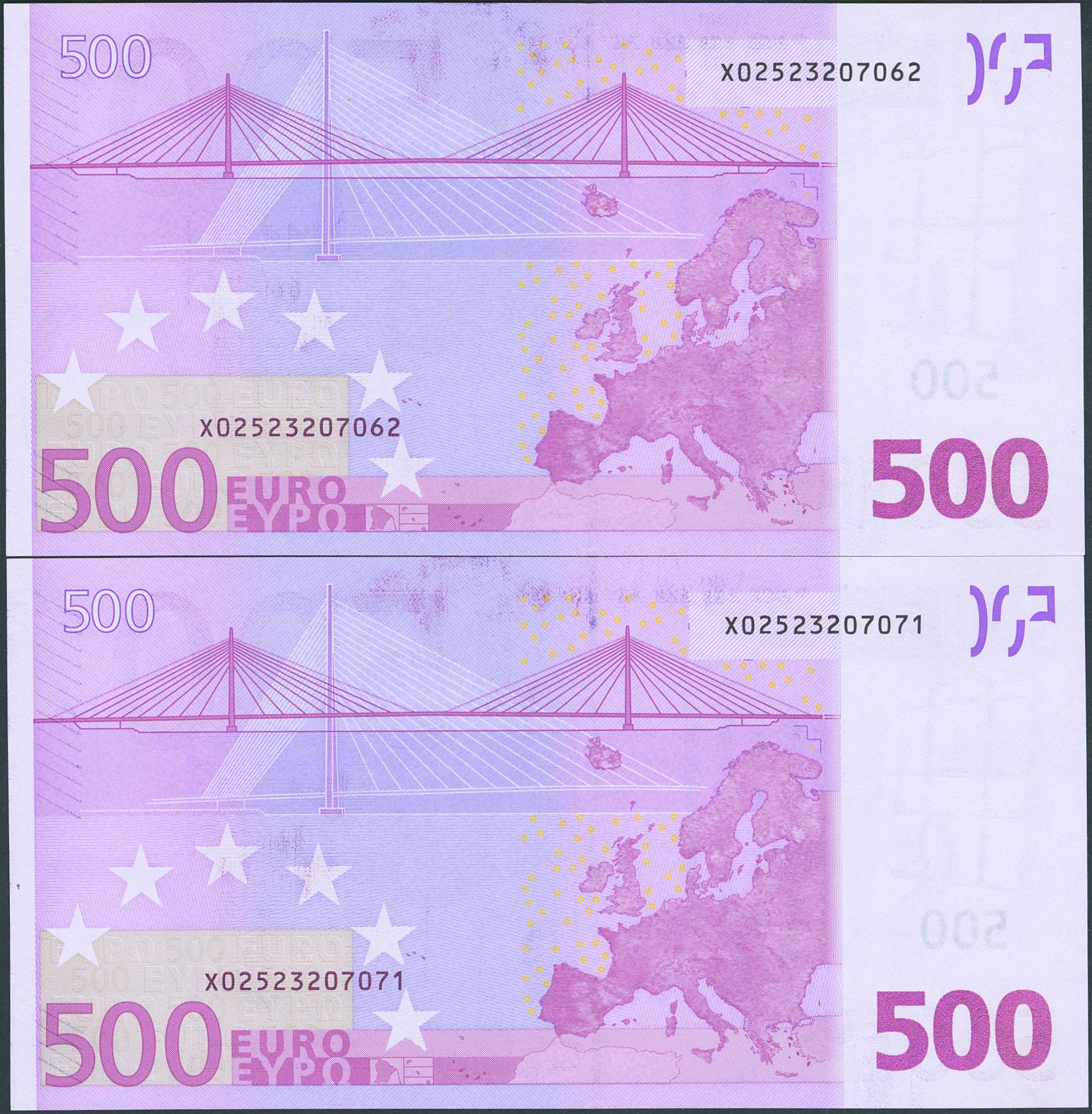 500 Euros. 1 de Enero de 2002. Pareja correlativa (cabe recordar que el último dígito de la numeración de todos los billetes denominados en euros es para control interno del Banco Central Europeo, el que marca la correlatividad de los billetes es el penúltimo dígito). Firma Trichet. Serie X (Alemania). (Edifil 2021: 492A). SC.