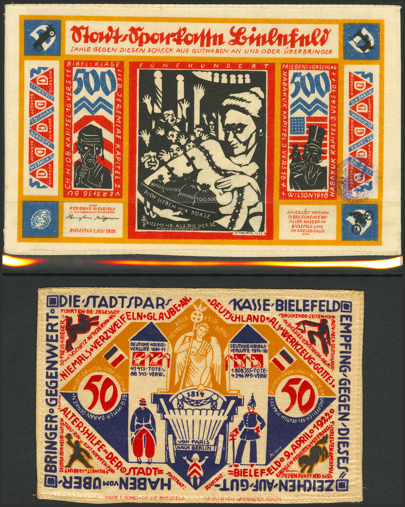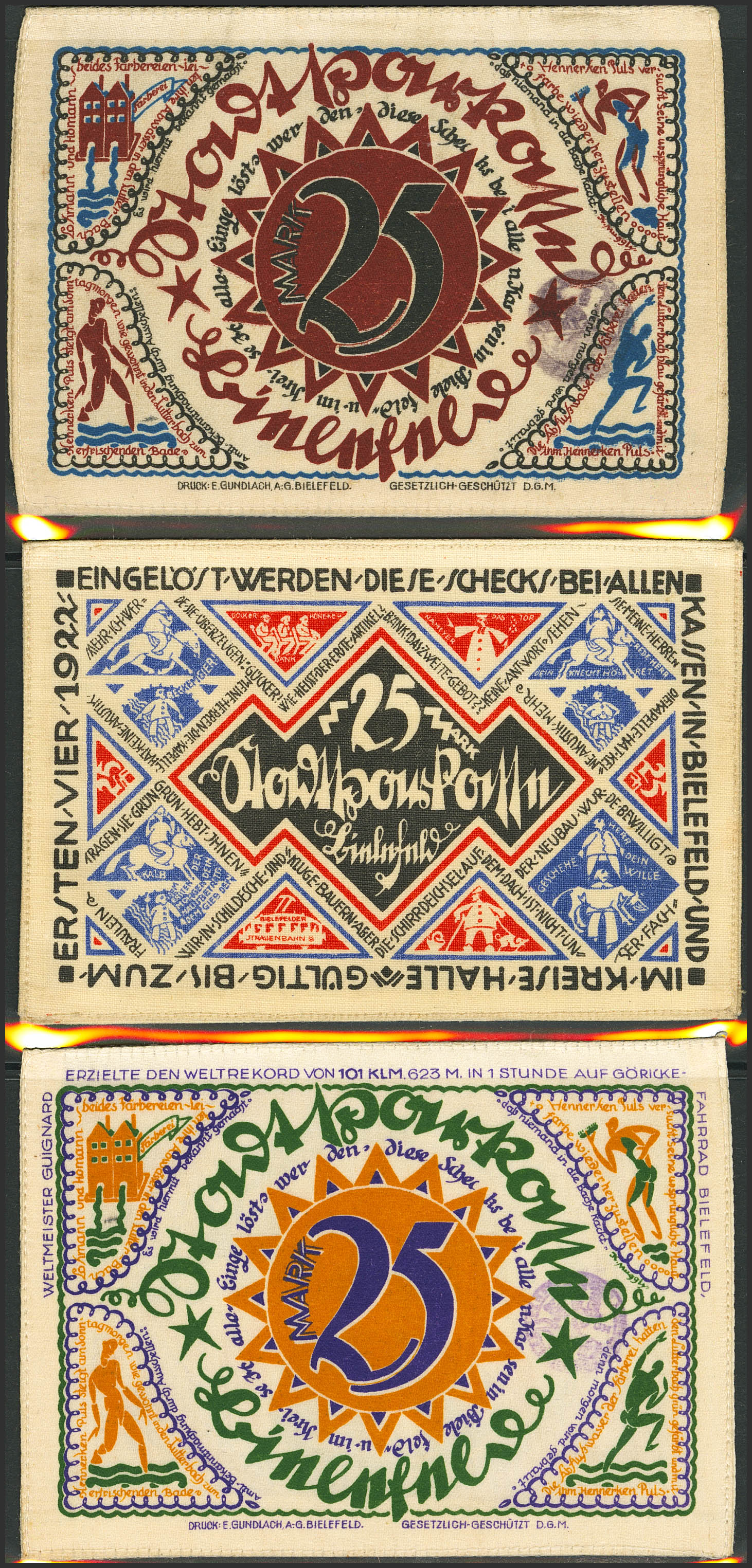 Interesting set of 5 banknotes from Germany, on silk and all of them from Bielefeld. Uncirculated.
