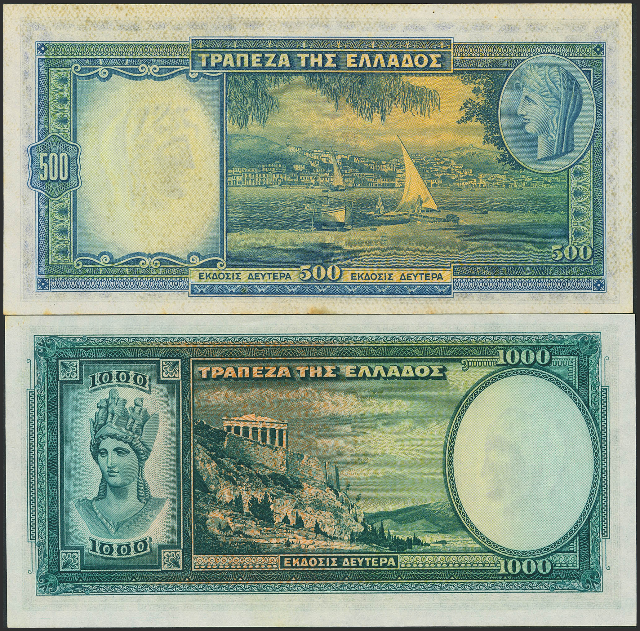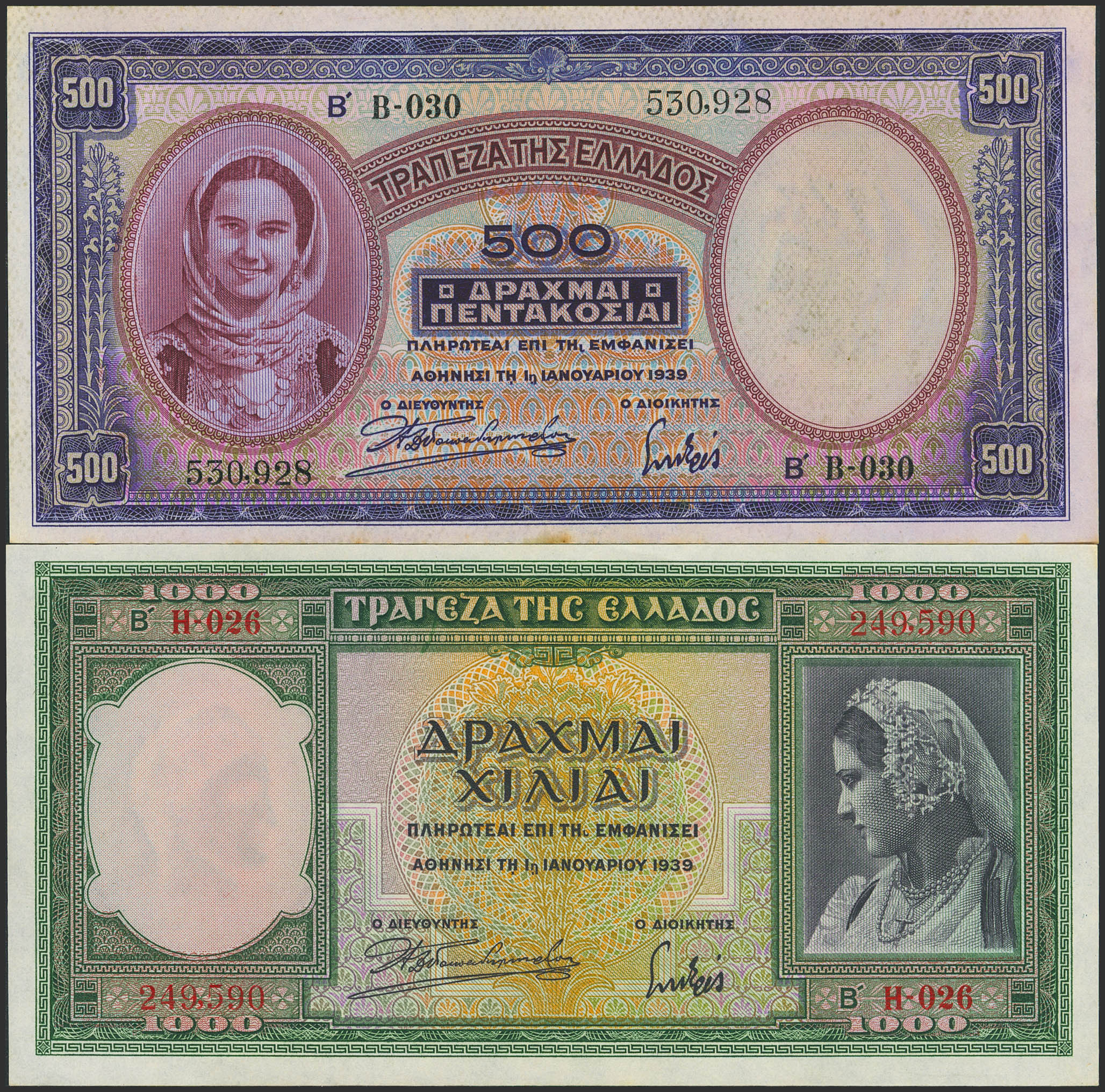GREECE. 500 Drachmai and 1000 Drachmai. 1 January 1939. (Pick: 109, 110). Uncirculated/About Uncirculated.