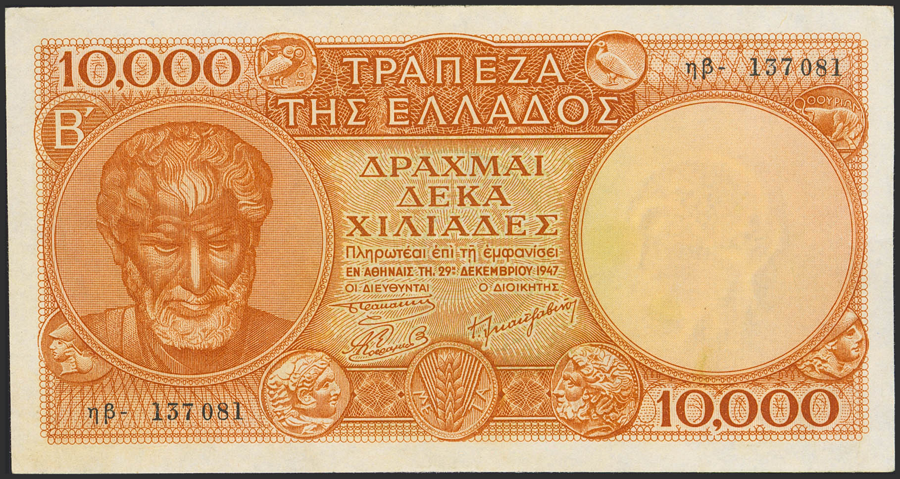 GREECE. 10000 Drachmai. 1947. (Pick: 182a). Extremely Fine.