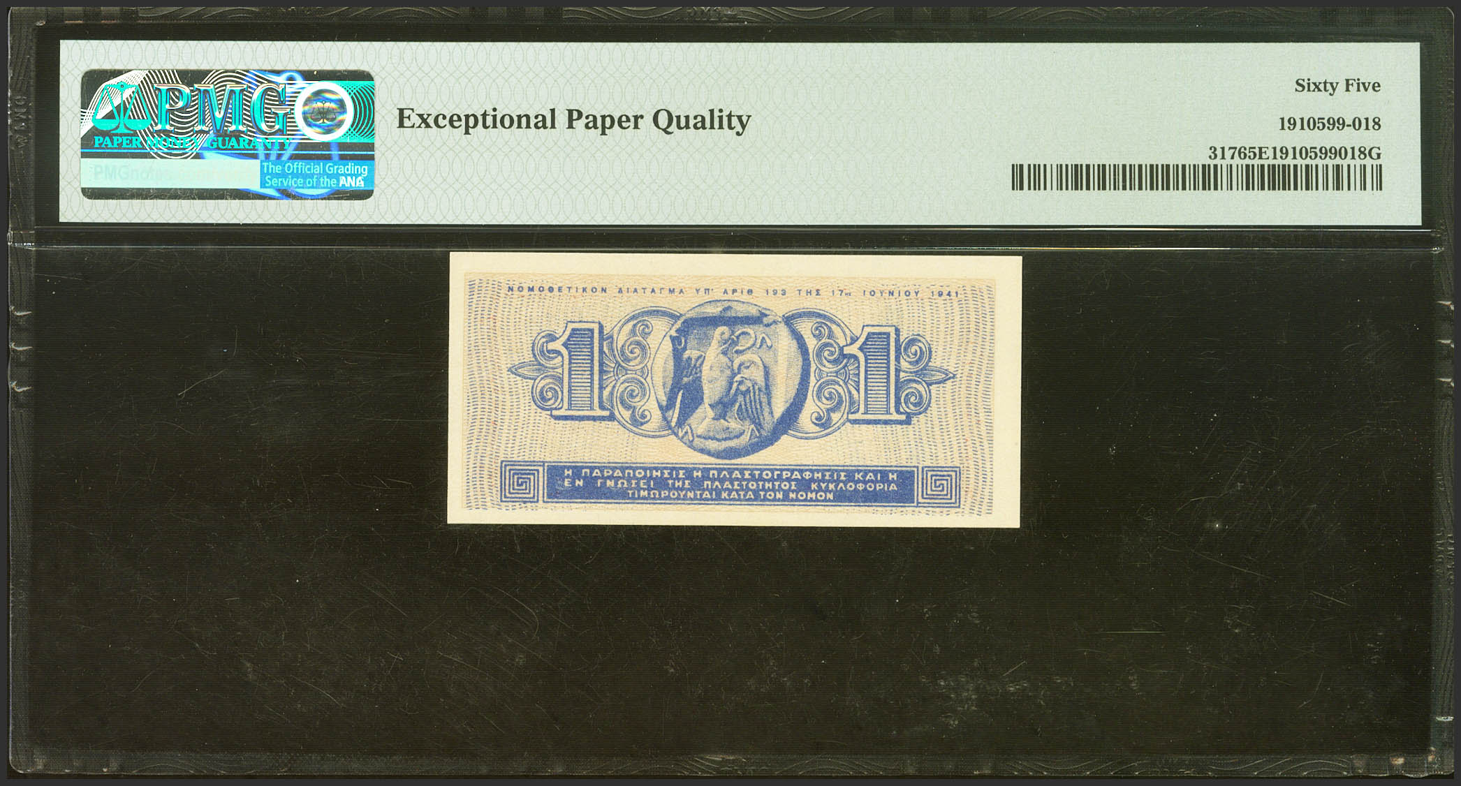 GREECE. 1 Drachma. Ministry of finance fractional currency. 1941. (Pick 317). PMG65EPQ.