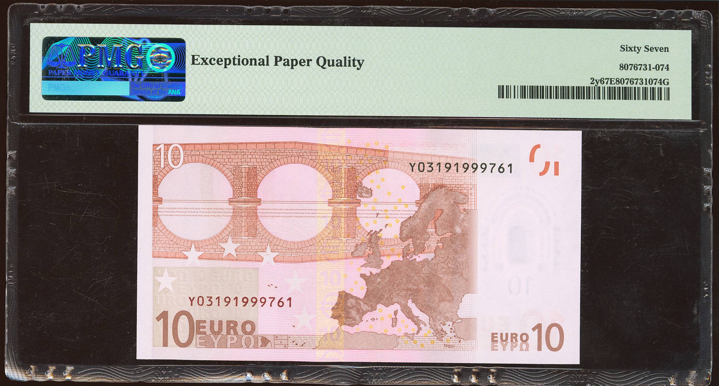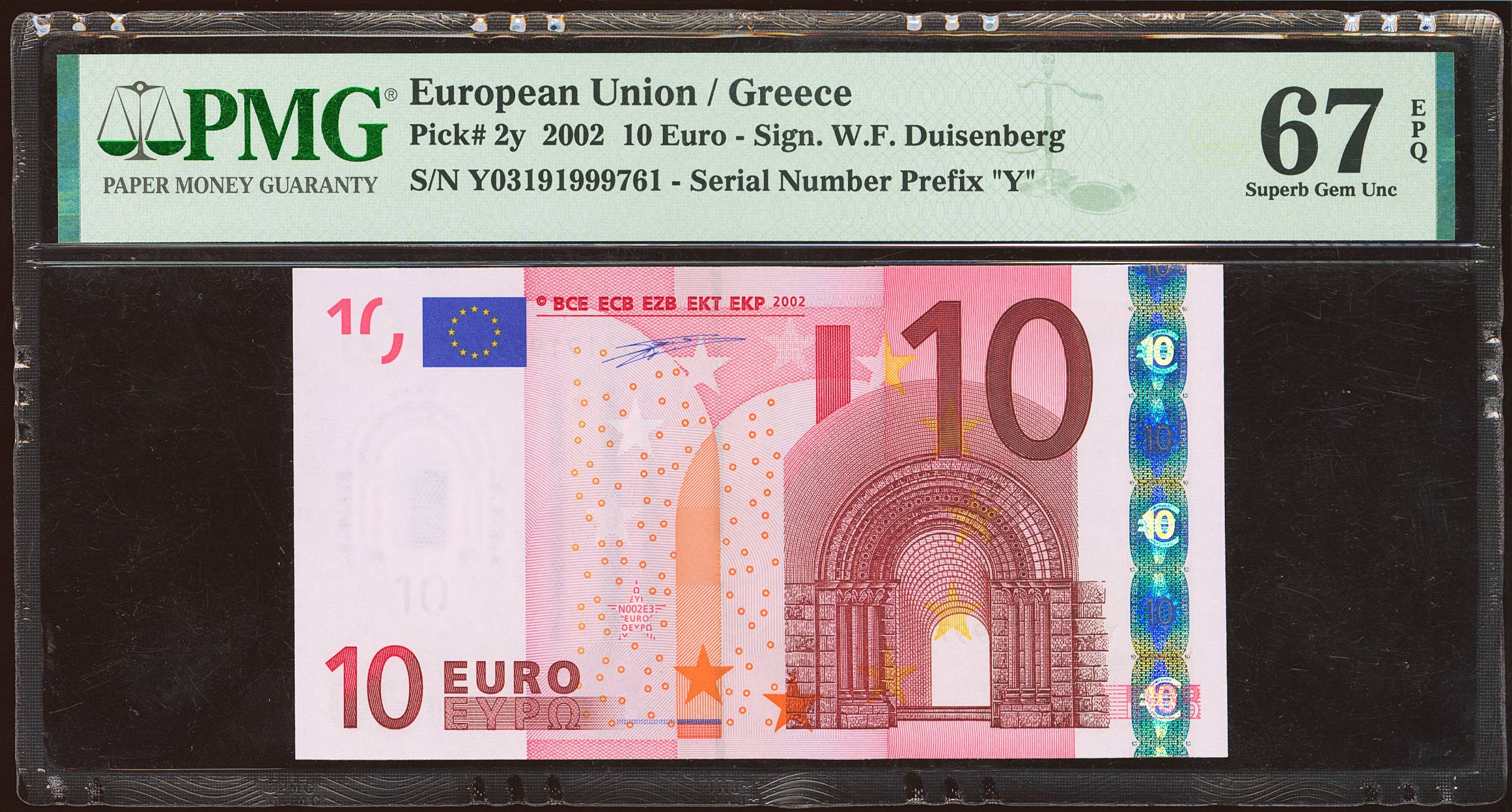 10 Euros. 1 de Enero de 2002. Firma Duisenberg. Serial Y (Grecia). (Edifil 2023: 487, Pick: 2y). Uncirculated. Encapsulado PMG67EPQ.