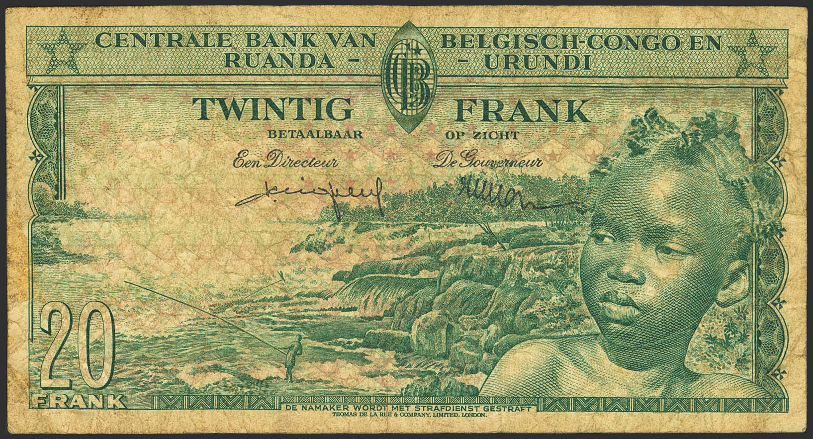 BELGIAN CONGO. 20 Francs. 1 December 1956. (Pick: 31). About Good.