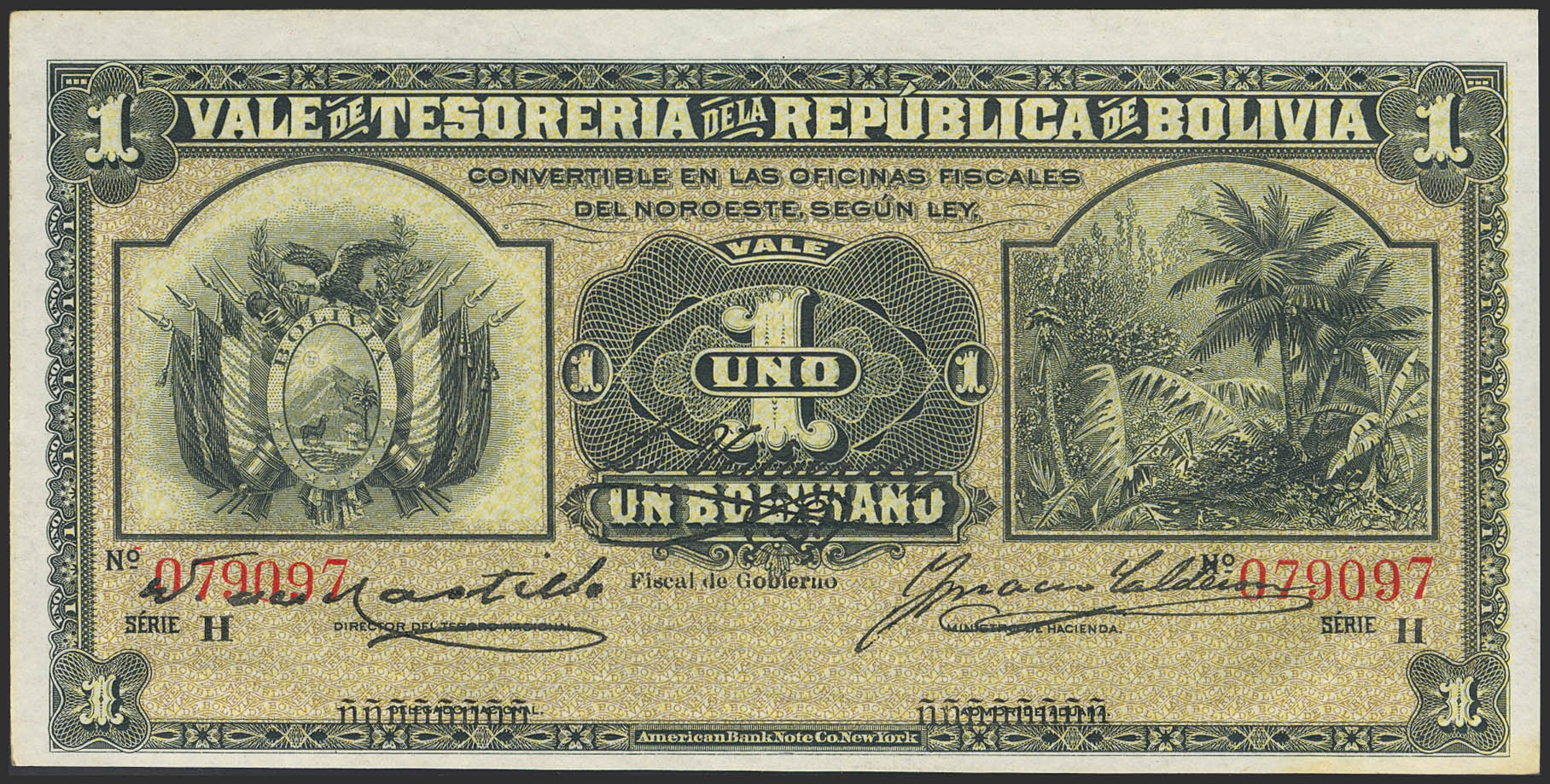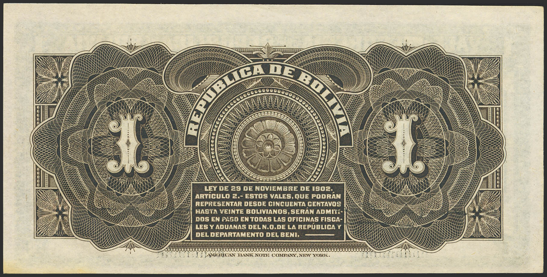 BOLIVIA. 1 Boliviano. 29 November 1902. Serie H. (Pick: 92). Less than Uncirculated.