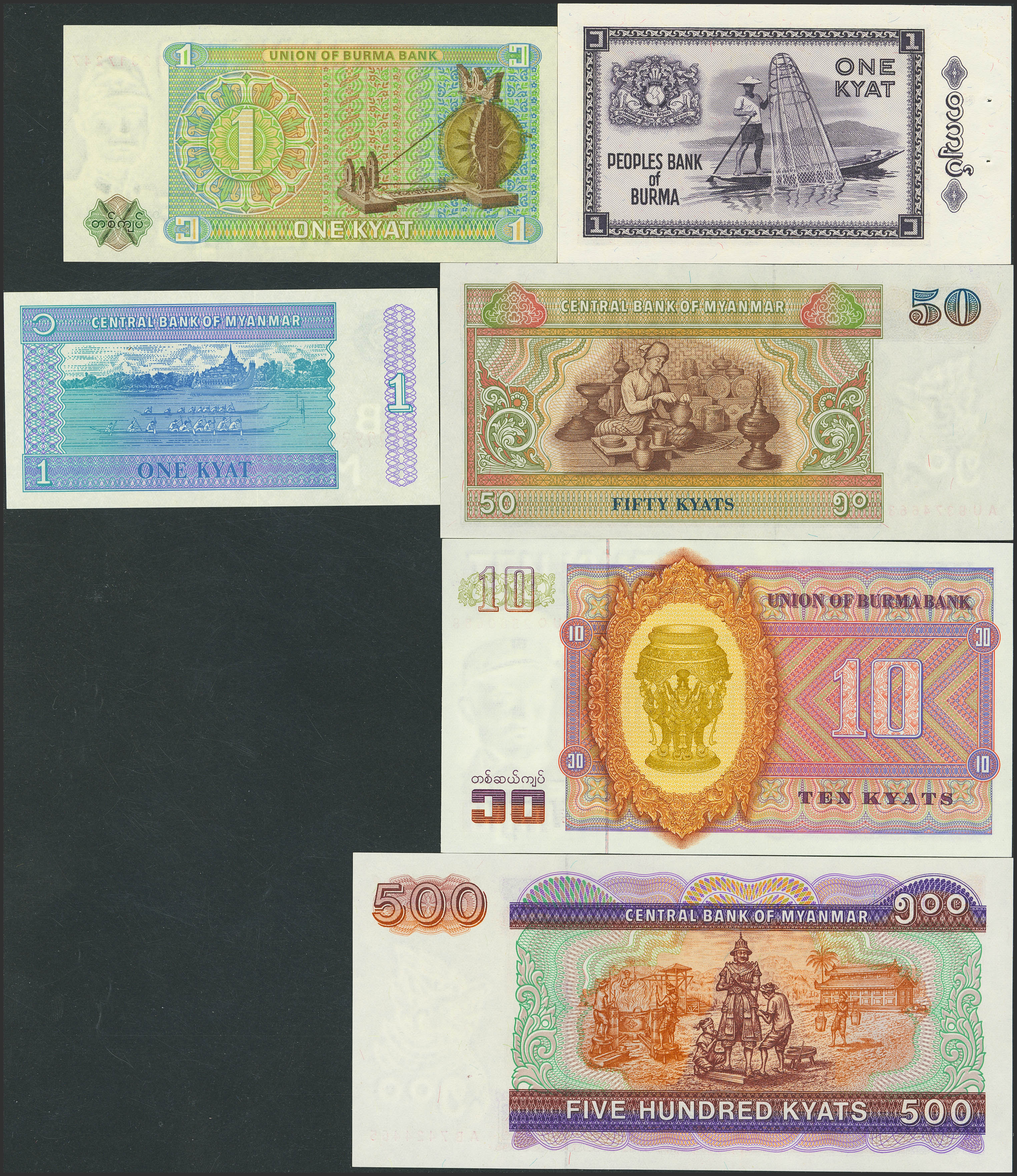 Set of 6 Myanmar banknotes, in different qualities and different issues. TO EXAMINE.