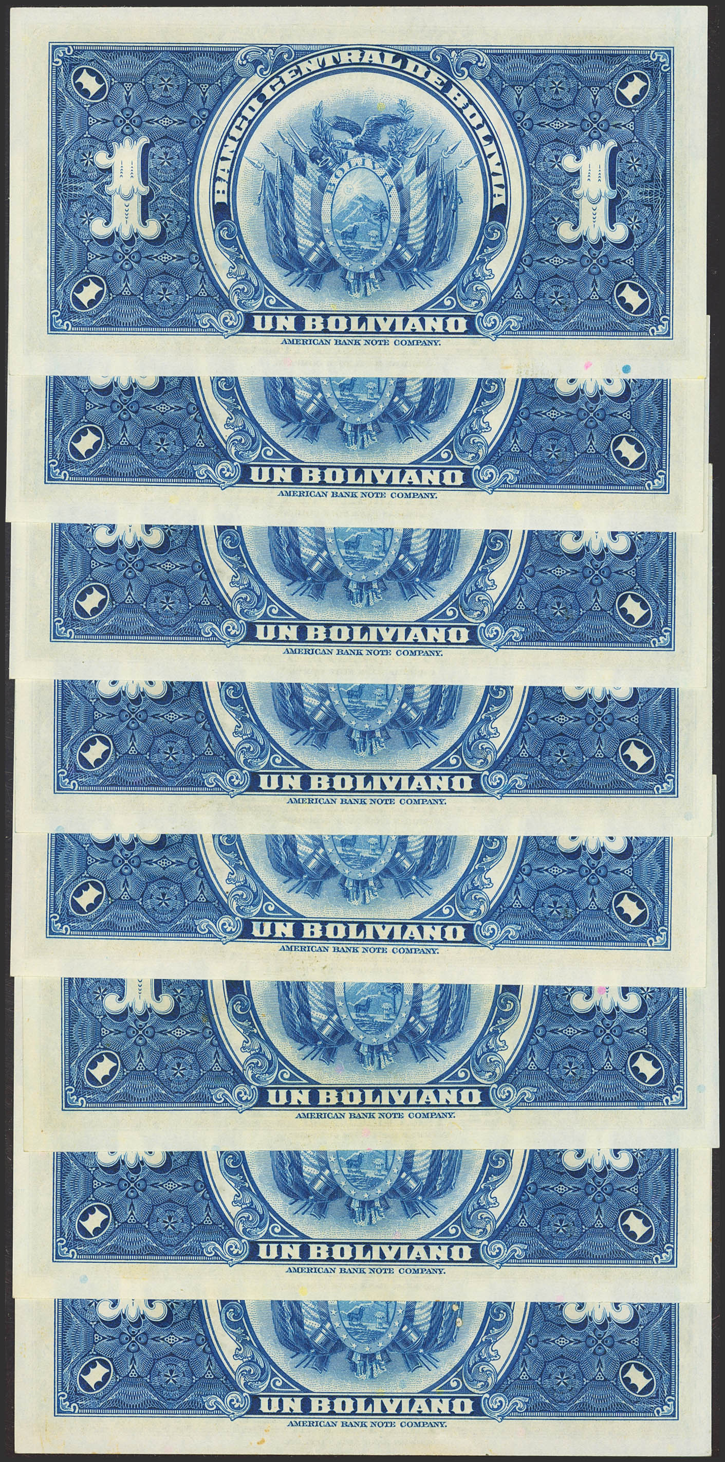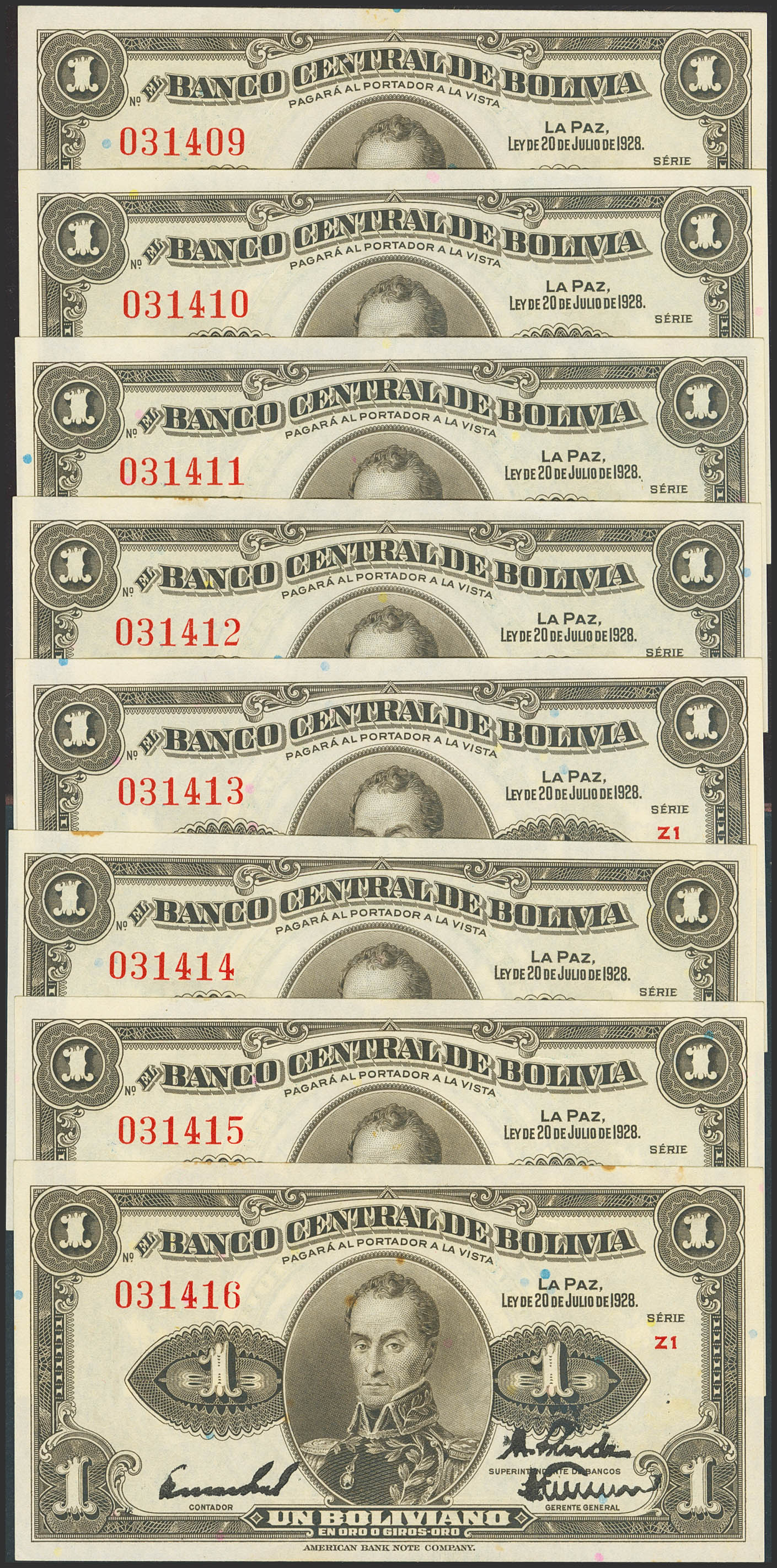 Set of 8 consecutives banknotes of Bolivia 1 Peso issued in 1928, with the serial Z1. (Pick: 119). Less than unciruculated / More than About Uncirculated.