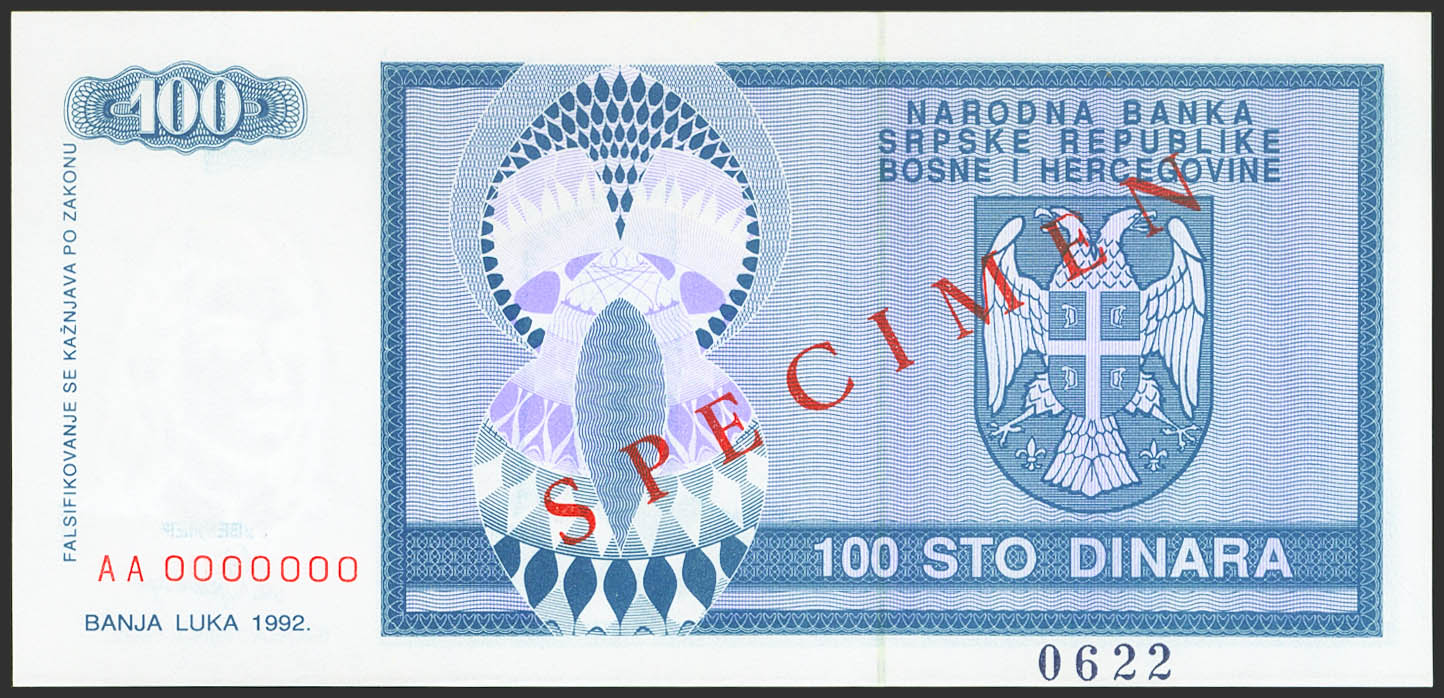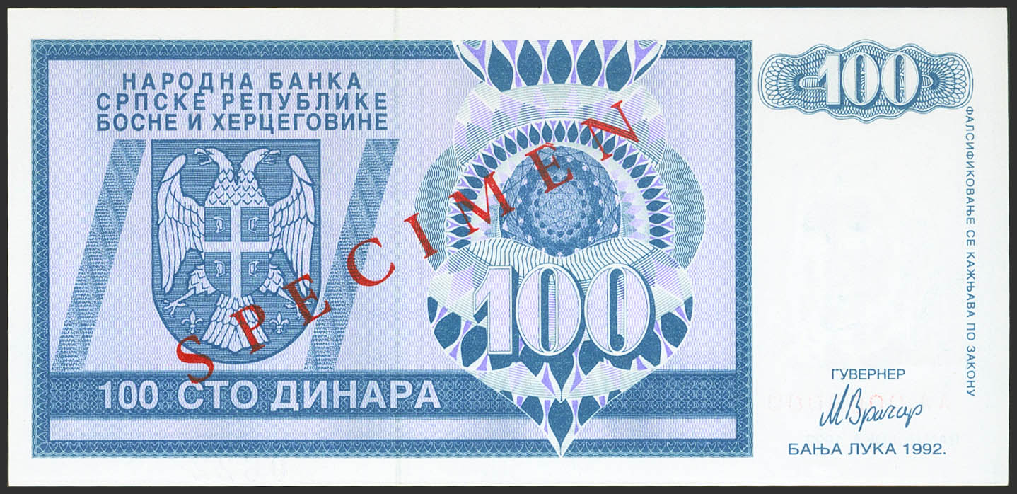 BOSNIA AND HERZEGOVINA. 100 Dinara. 1992. SPECIMEN. (Pick: 135s). Uncirculated.
