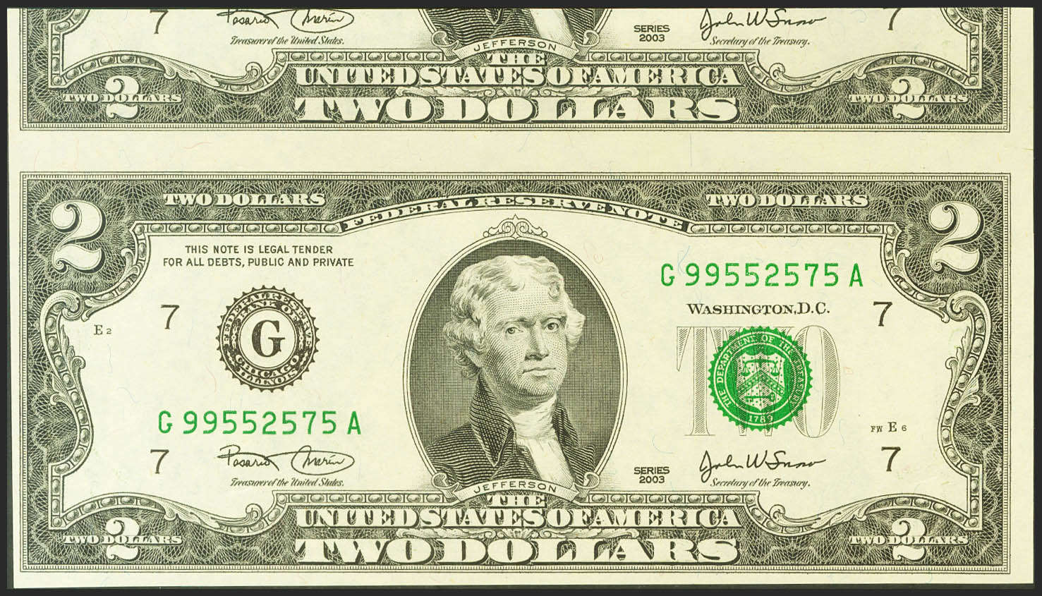 UNITED STATES. 2 Dollars. 2003. Serial G-A. Guillotining error. (Pick: 516a). Uncirculated.