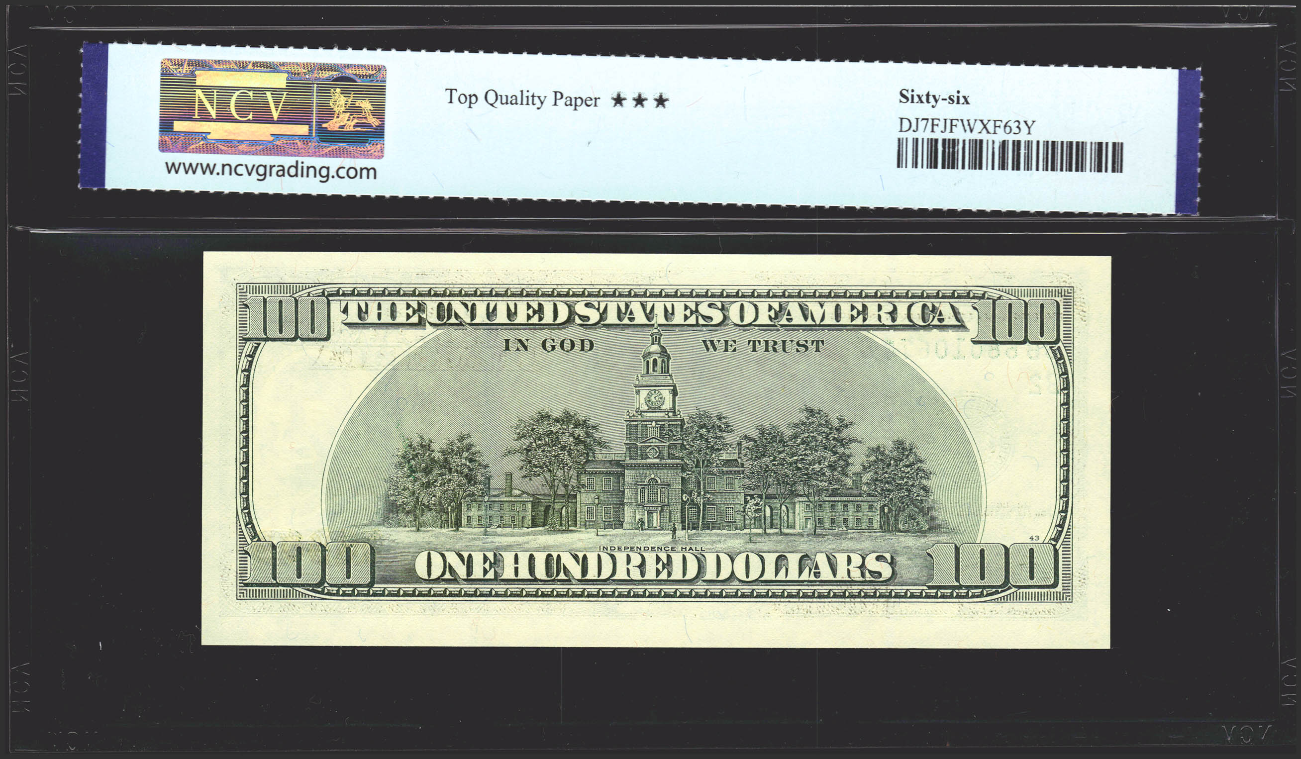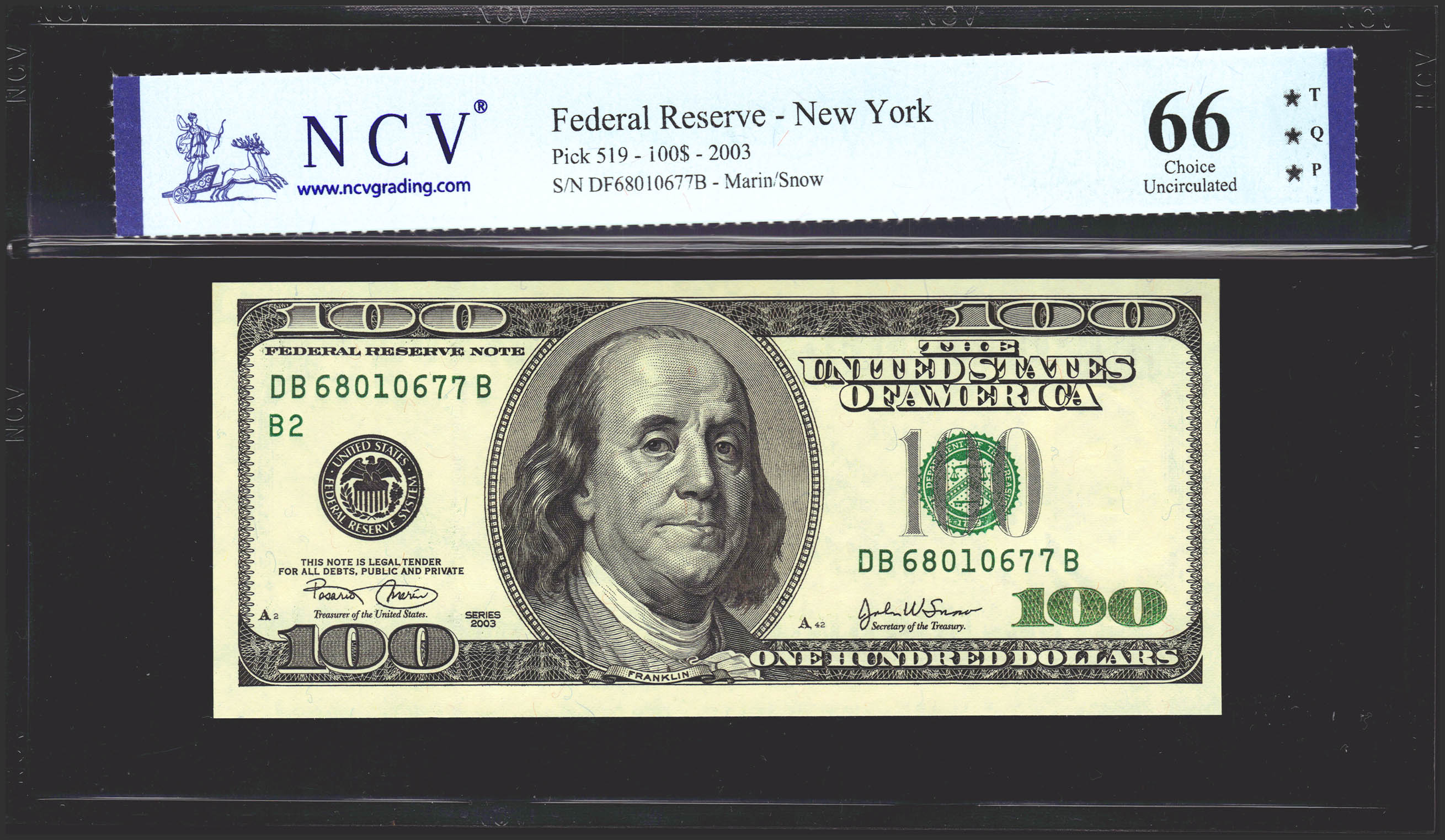 USA. 100 Dollars. Federal Reserve Note. Serial number DB-B. 2003. (Friedberg: 2178B, Pick: 519a). Uncirculated. Encapsulated NCV66TQP.