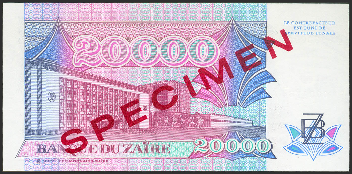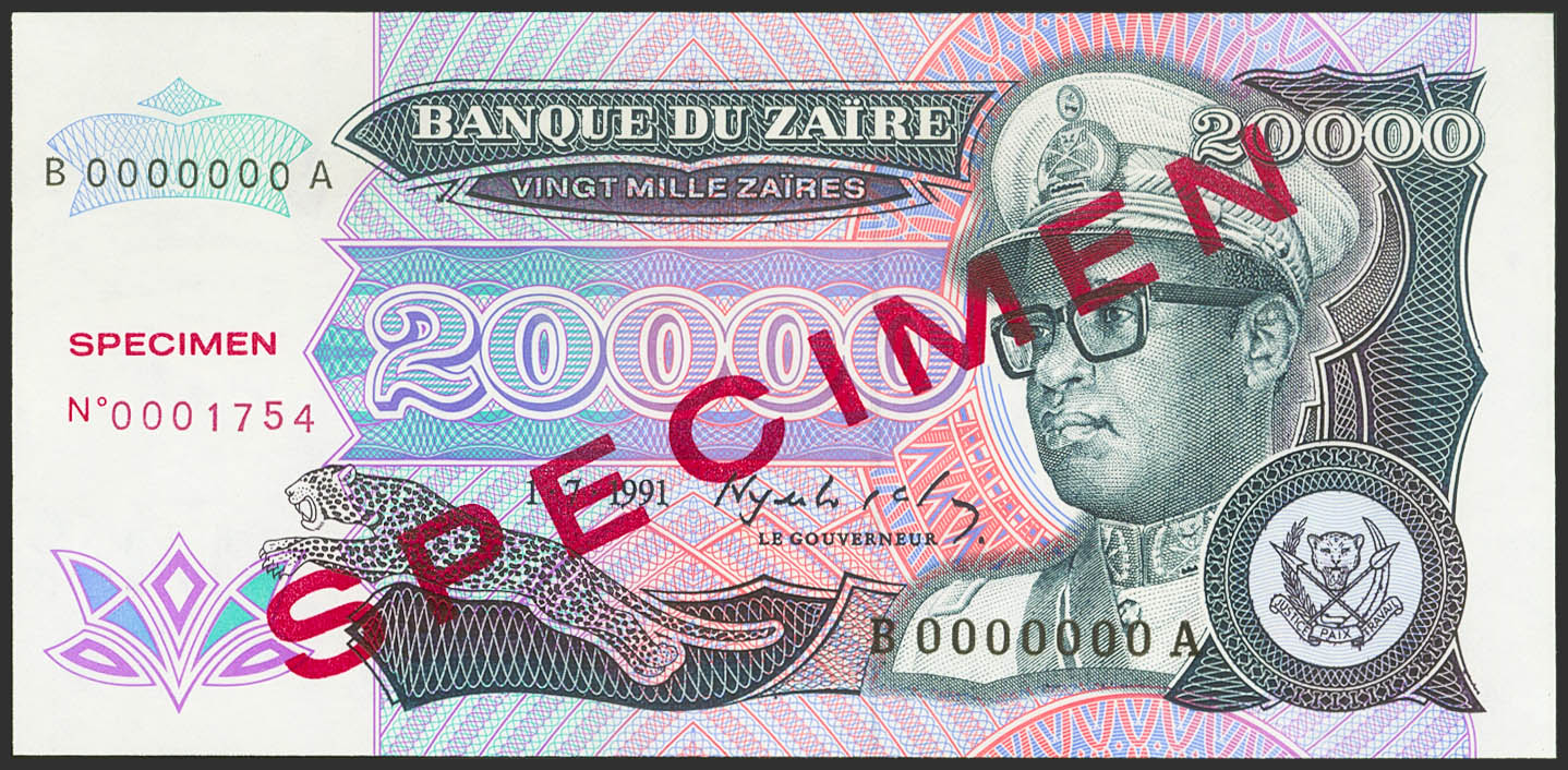 ZAIRE. 20000 Zaïres. 1 July 1991. SPECIMEN. (Pick: 39s). Uncirculated.