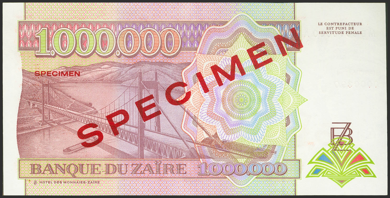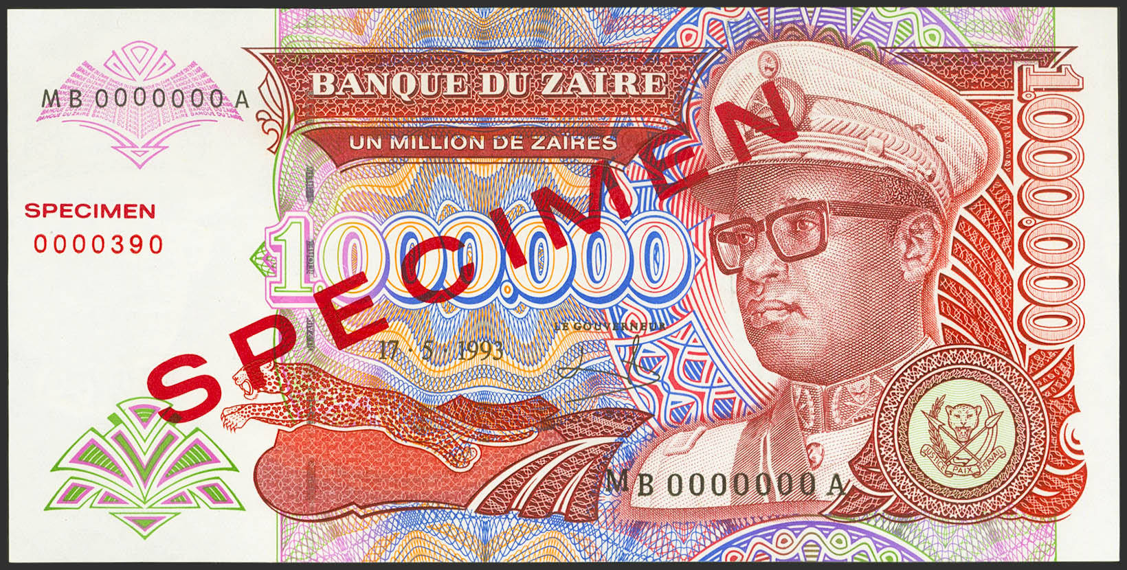 ZAIRE. 100000 Zaïres. 1 May 1993. SPECIMEN. (Pick: 44s). Uncirculated.