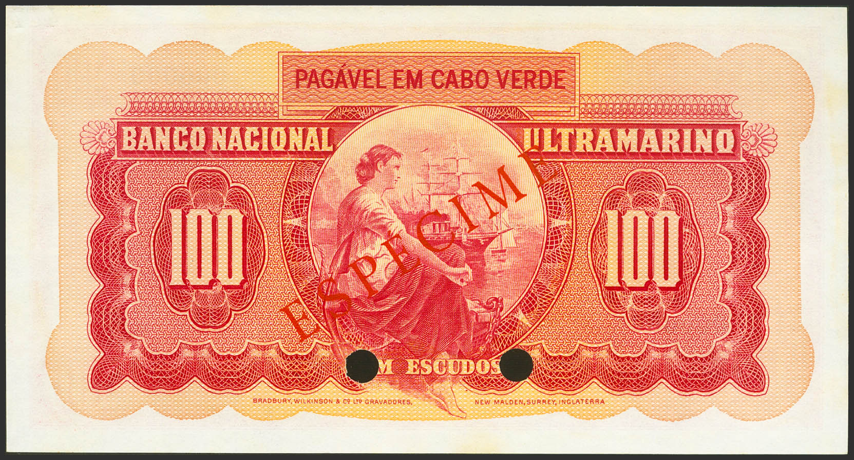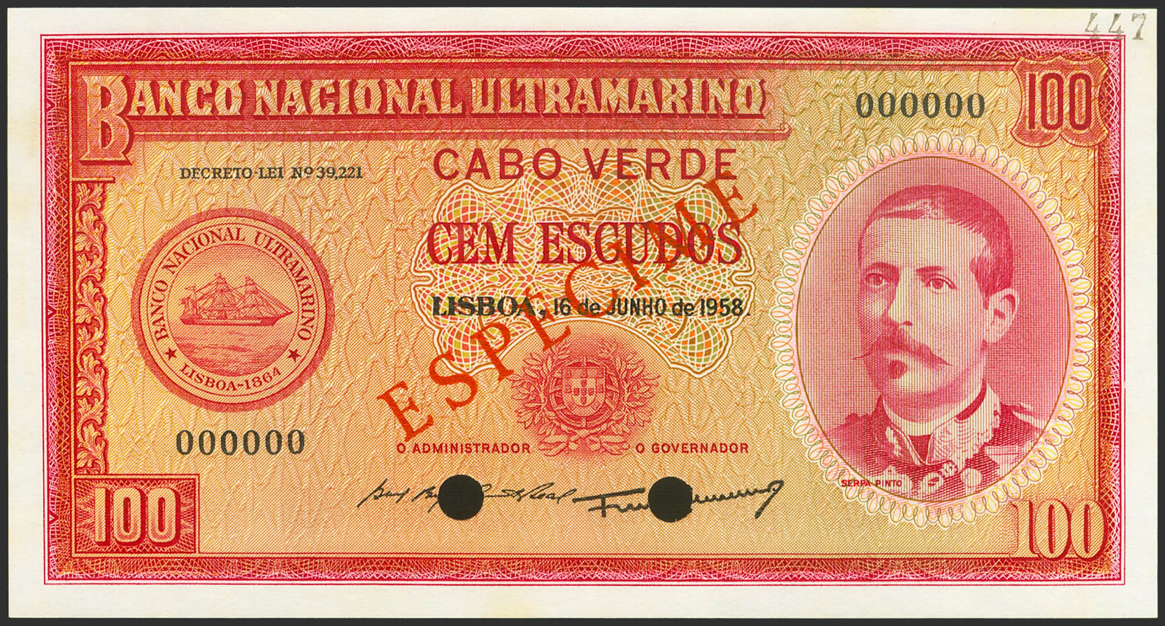 CAPE VERDE. 100 Escudos. Specimen and numeration 000000. 1958. (Pick 49s). Uncirculated.