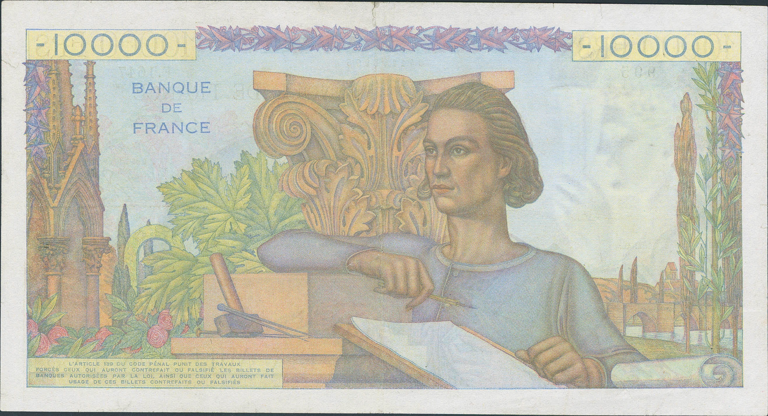 FRANCE. 10000 Francs. 1951. (Pick: 132d). Small tears in the upper margin and on the right margin and pinholes. Fine.