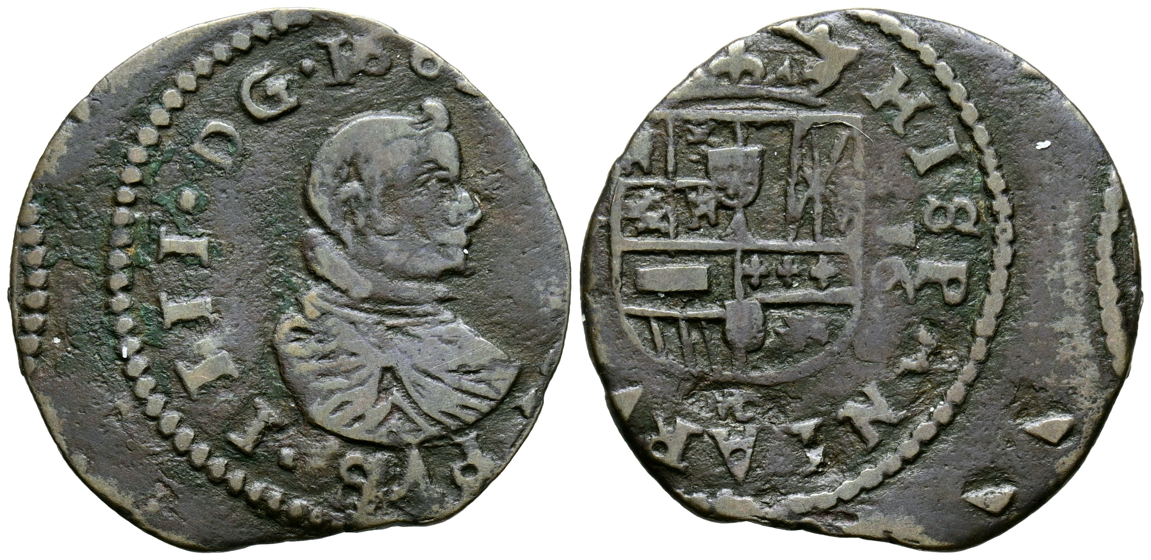 FELIPE IV (1621-1665). Fragmento de riel con 1 moneda de 16 Maravedís. (Ae. 3,50g/26mm). Madrid. Marca de ensayador no visible. 1661. (Cal-2019-Tipo 134). Marca de ceca MD bajo el escudo. MBC. Escasa pieza en la que se pueden apreciar en el reverso dos puntos de agarre.