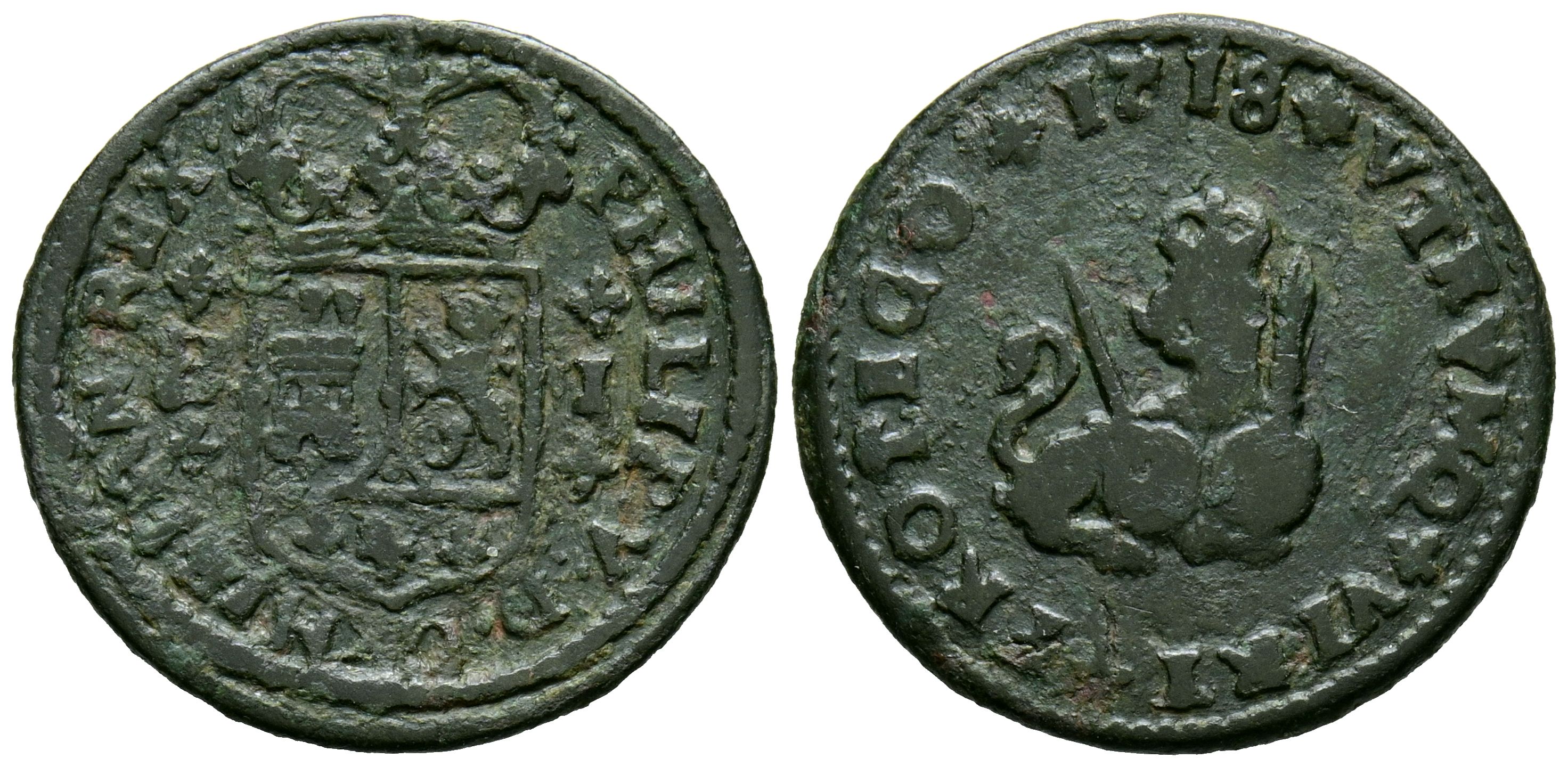 FELIPE V (1700-1746). 1 Maravedí. (Ae. 2,13g/20mm). 1718. Barcelona. (Cal-2019-98). MBC-.