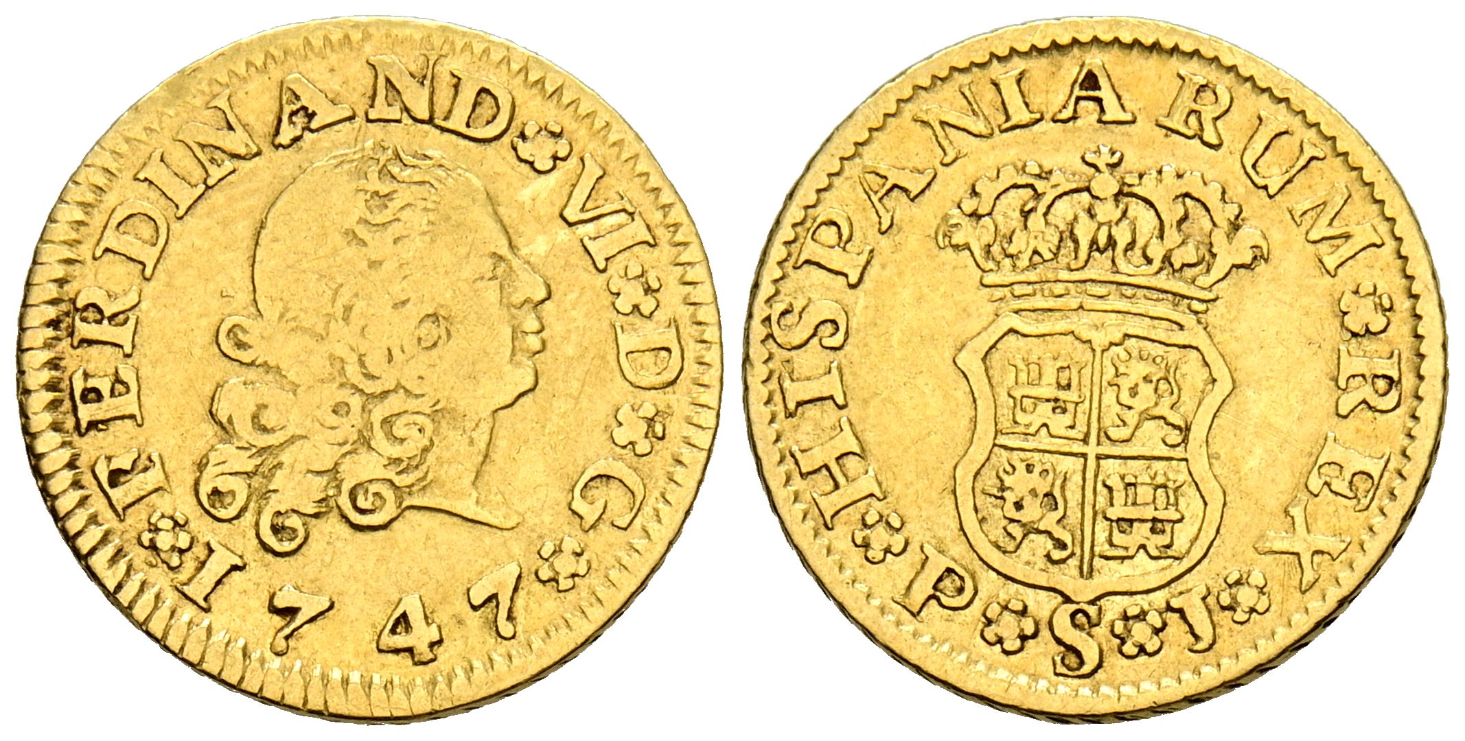 FERNANDO VI (1746-1759). 1/2 Escudo. (Au. 1,74g/15mm). 1747. Sevilla PJ. (Cal-2019-569). MBC-.