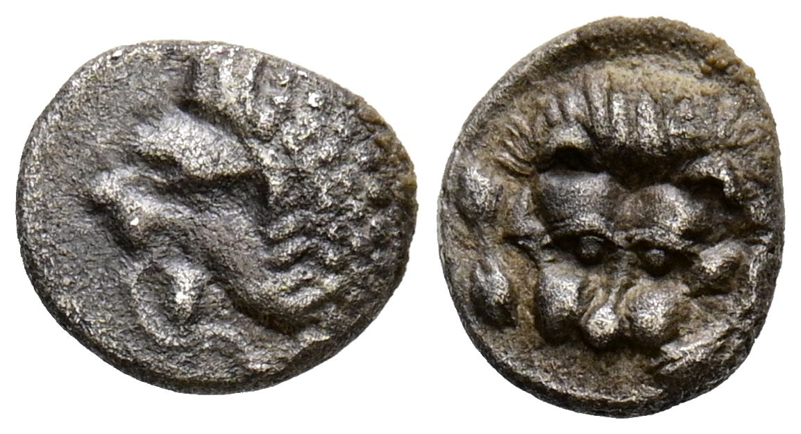 CARIA, Hekatomnos. Hemióbolo. (Ar. 0,52g/8mm). 393-353 a.C. Ceca indeterminada. (SNG Tübingen 3310; McClean 8517). Anv: Cabeza de león a izquierda. Rev: Prótomo de león de frente. MBC+.