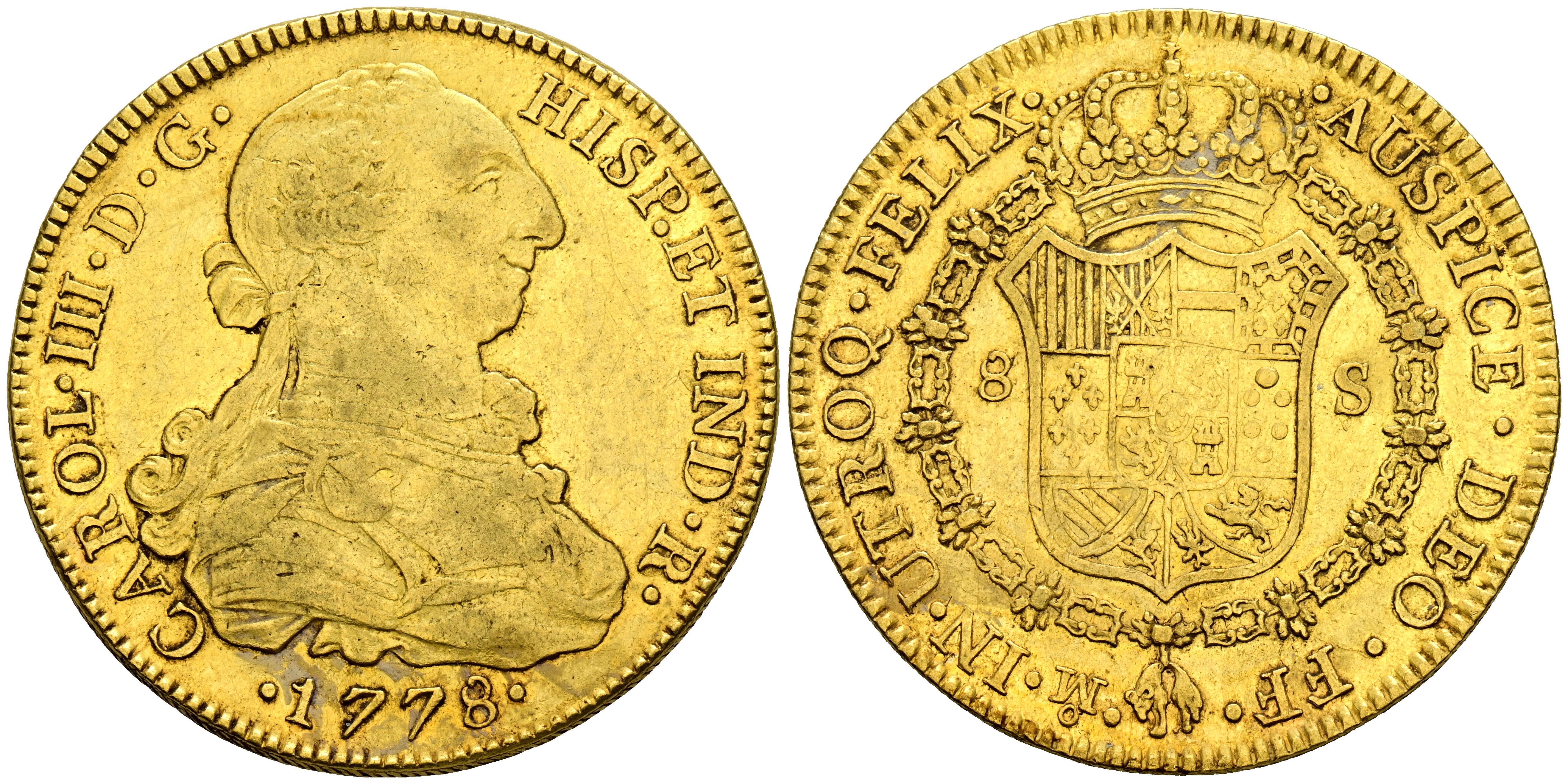 CARLOS III (1759-1788). 8 Escudos. (Au. 27,02g/37mm). 1778. México FF. (Cal-2019-2007). Ceca y ensayadores invertidos. MBC+.