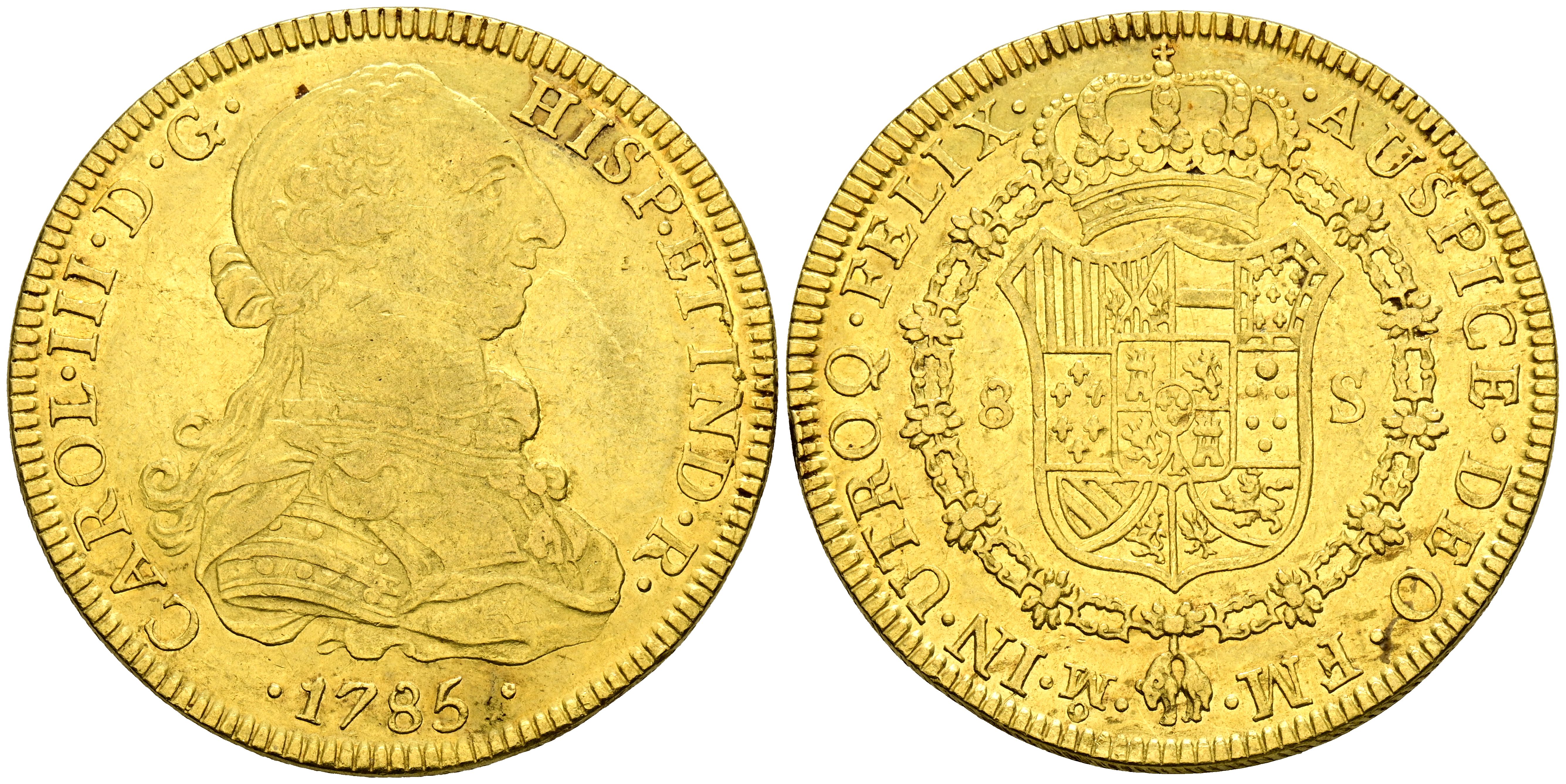 CARLOS III (1759-1788). 8 Escudos. (Au. 26,90g/38mm). 1785. México FM. (Cal-2019-2020). Ceca y ensayadores invertidos. MBC+/EBC-.