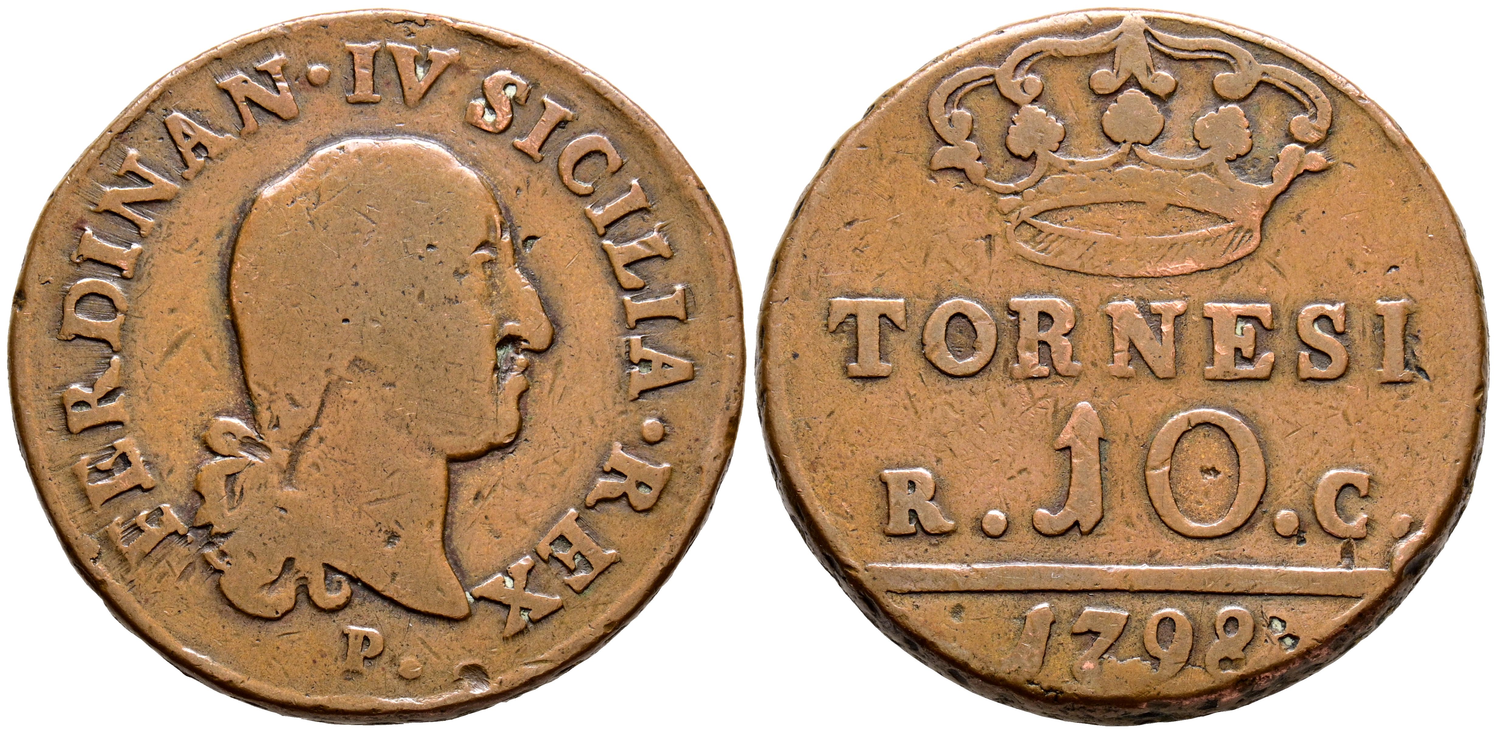 FERNANDO IV de Nápoles, infante de España. 10 Tornesi (Ae. 22,33g/35mm). 1798. (Vicenti 233). MBC. Escasa.