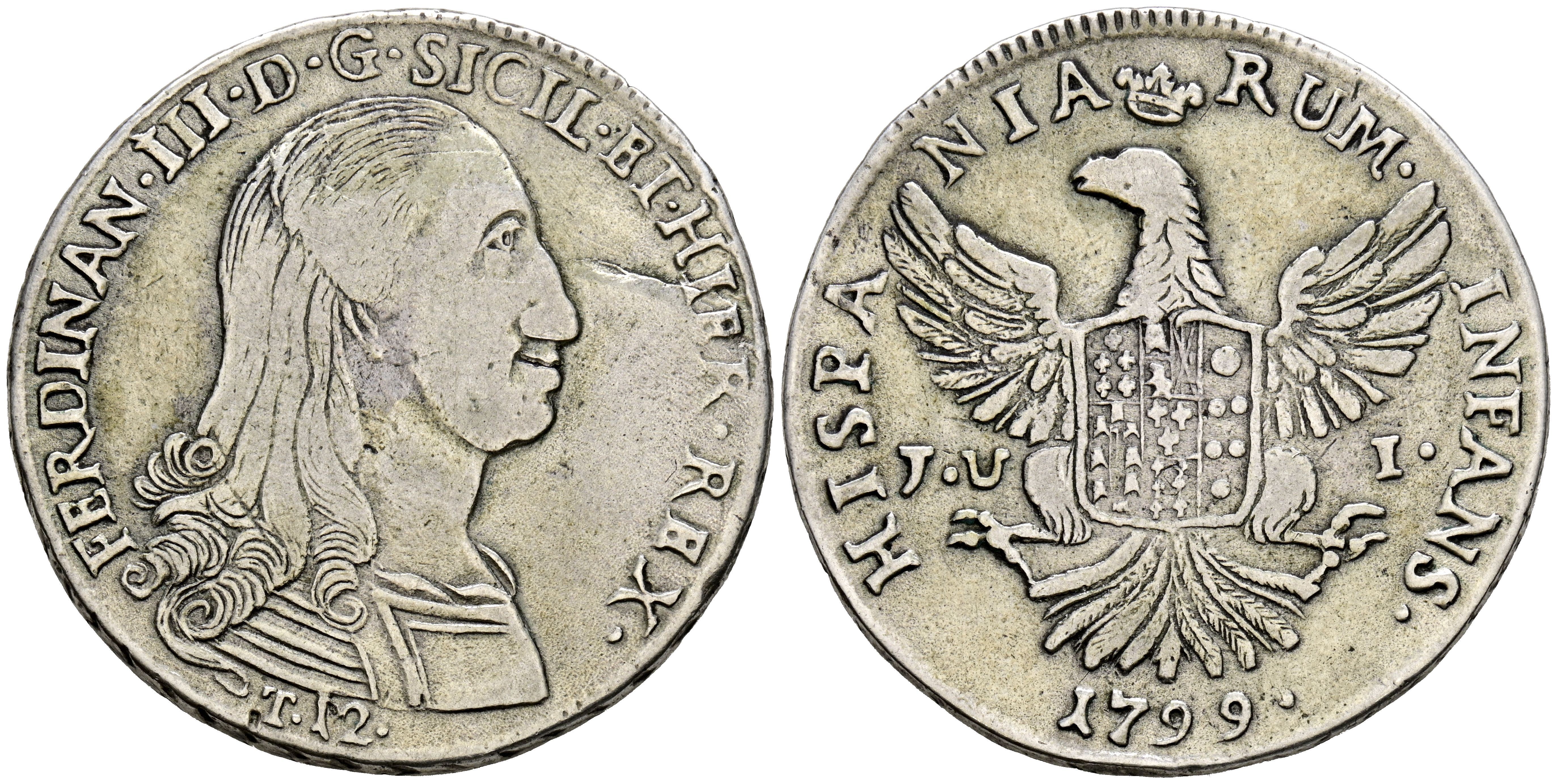 FERNANDO III (De Sicilia. Infante de España). 12 Taris (Ar. 26,73g/39mm). 1799. Palermo JVI. (Vicenti-132). Hijo de Carlos III. MBC. Escasa.