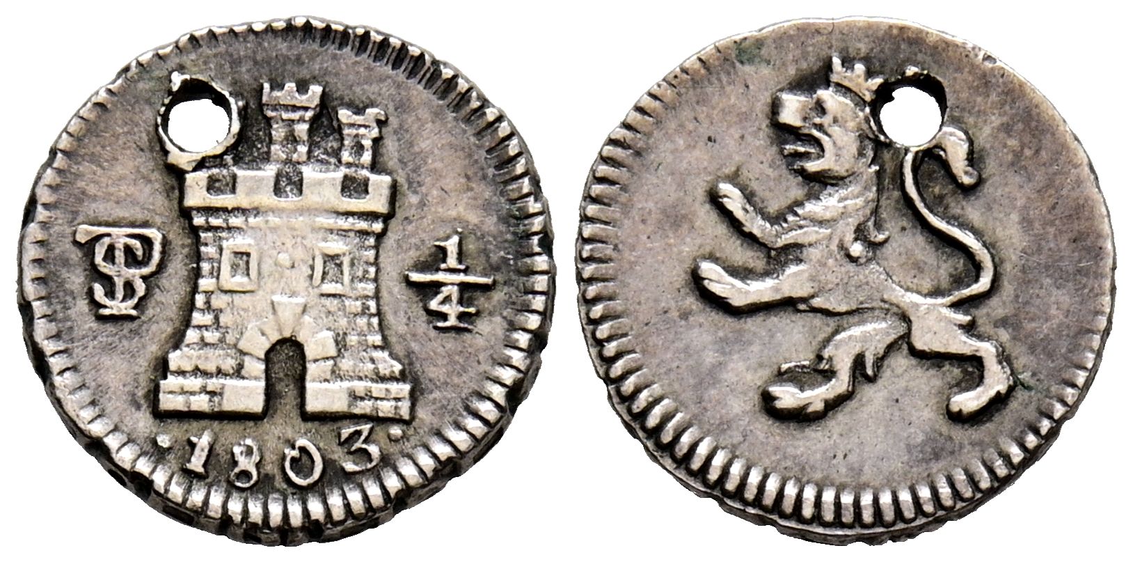 CARLOS IV (1788-1808). 1/4 Real. (Ar. 0,84g/12mm). 1803. Potosí. (Cal-2019-153). MBC. perforación. Bonito tono.