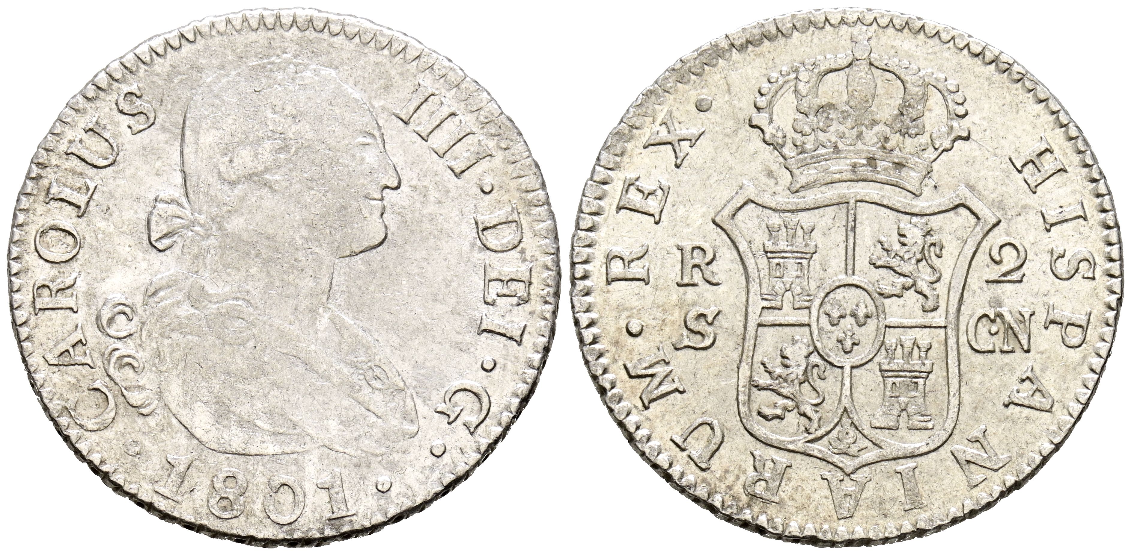 CARLOS IV (1788-1808). 2 Reales. (Ar. 5,96g/26mm). 1801. Sevilla CN. (Cal-2019-722). MBC+. Restos de brillo original.