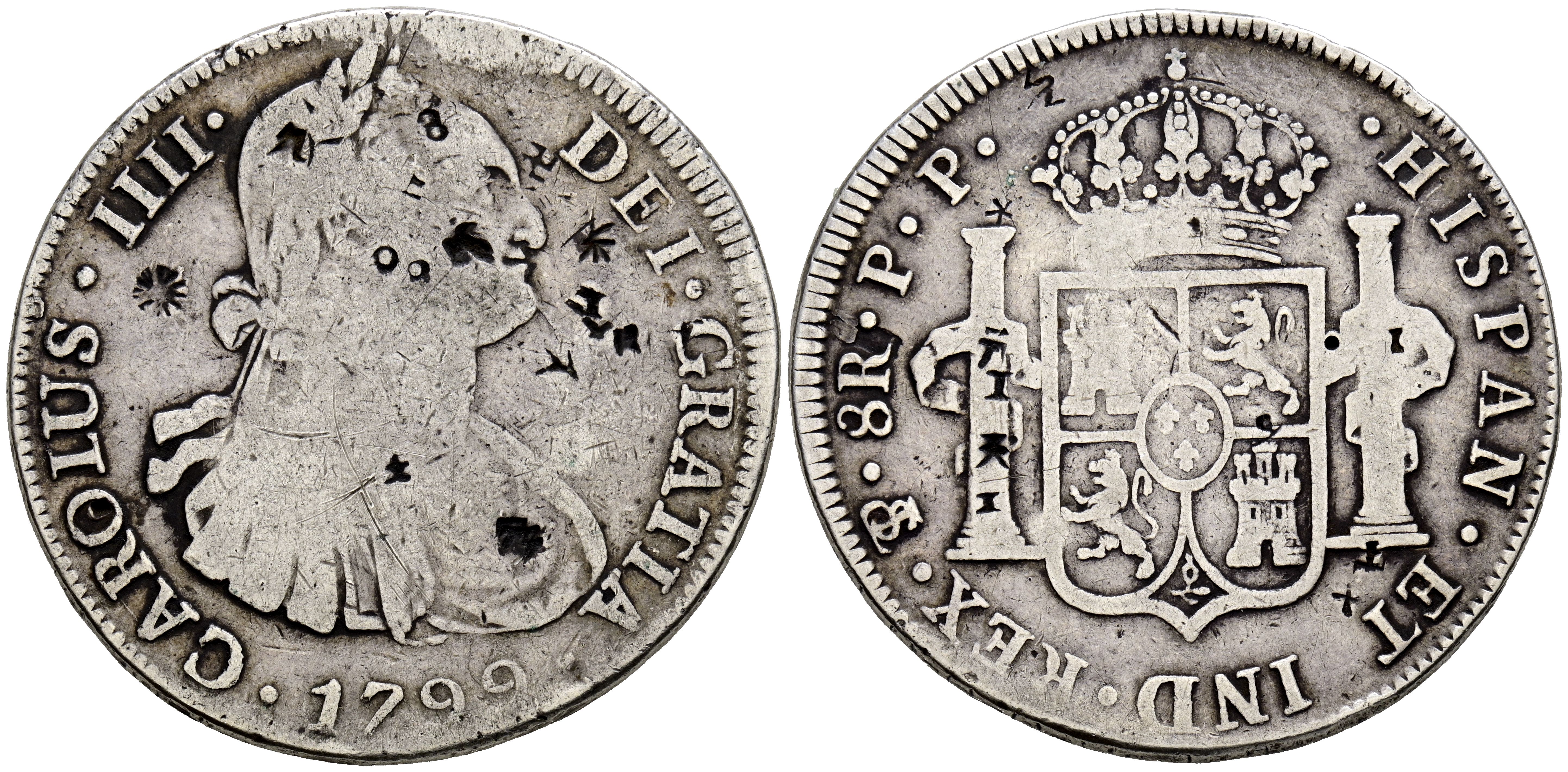 CARLOS IV (1788-1808). 8 Reales. (Ar. 26,20/41mm). 1799. Potosí PP. (Cal-2019-1003). BC+. Resellos orientales.