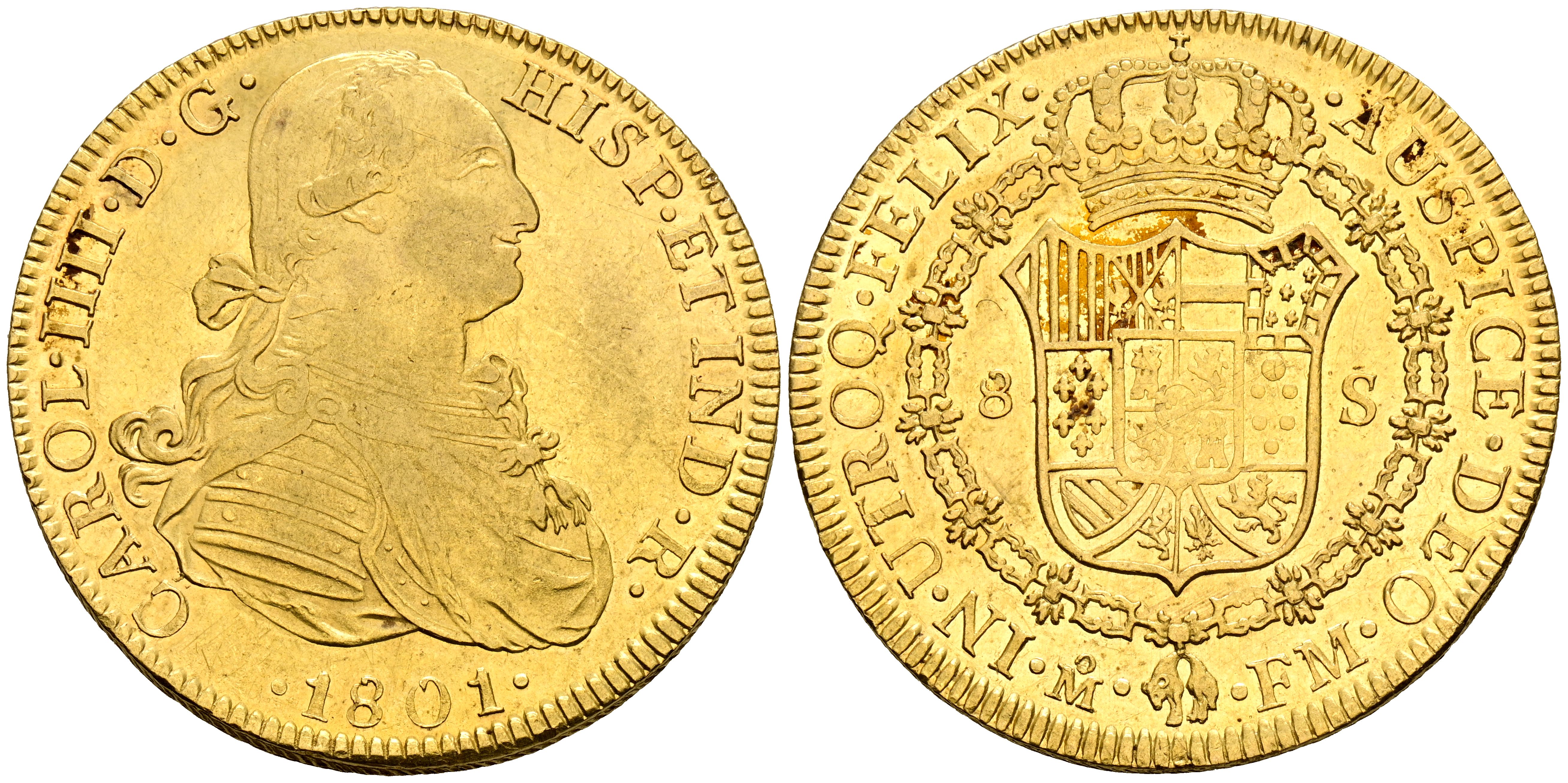 CARLOS IV (1788-1808). 8 Escudos. (Au. 27,02g/37mm). 1801. México FM. (Cal-2019-1643). EBC. Bonito tono.
