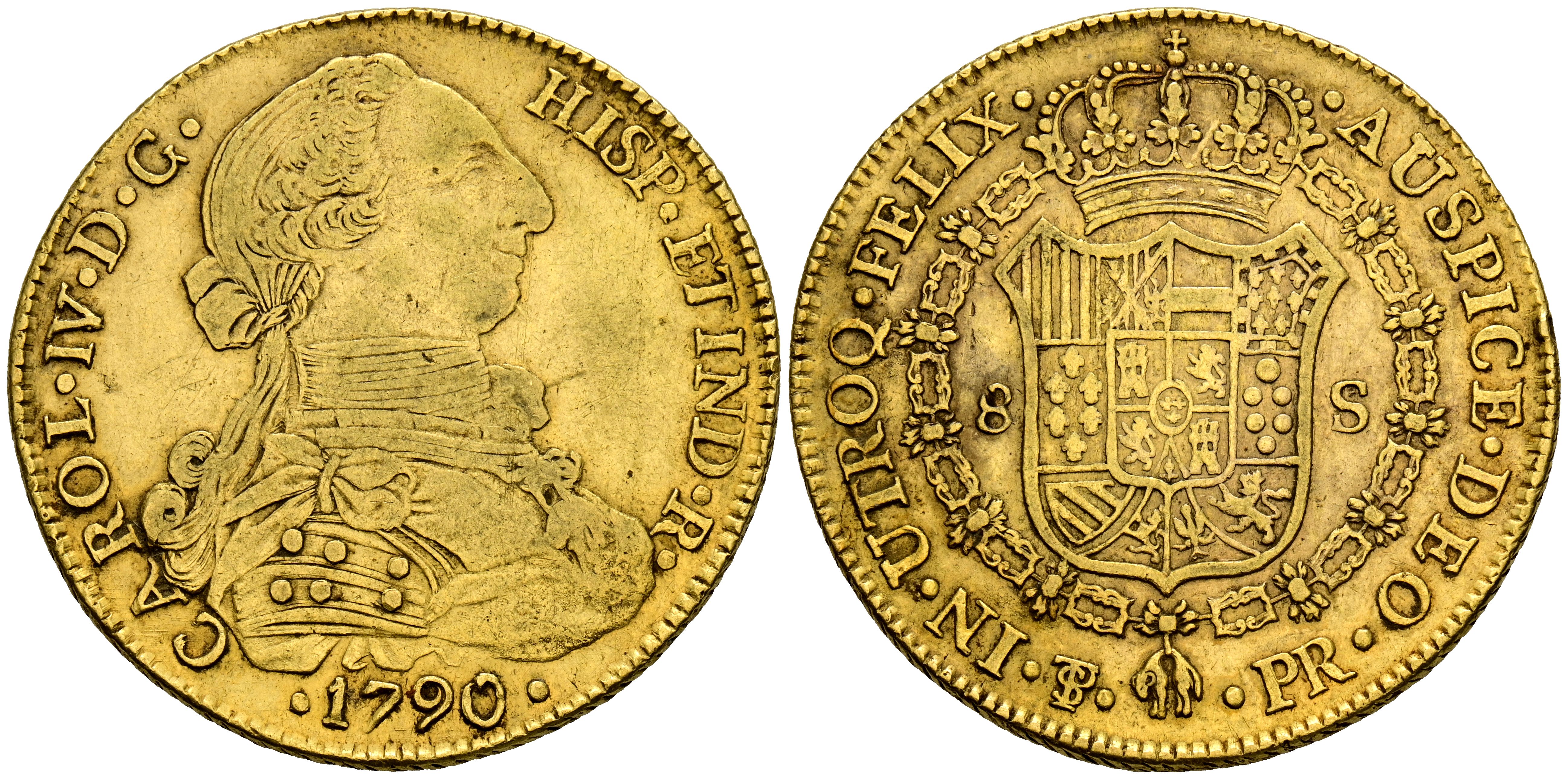 CARLOS IV (1788-1808). 8 Escudos. (Au. 26,90g/38mm). 1790. Potosí PR. (Cal-2019-1693). Busto de Carlos III y ordinal IV. MBC.
