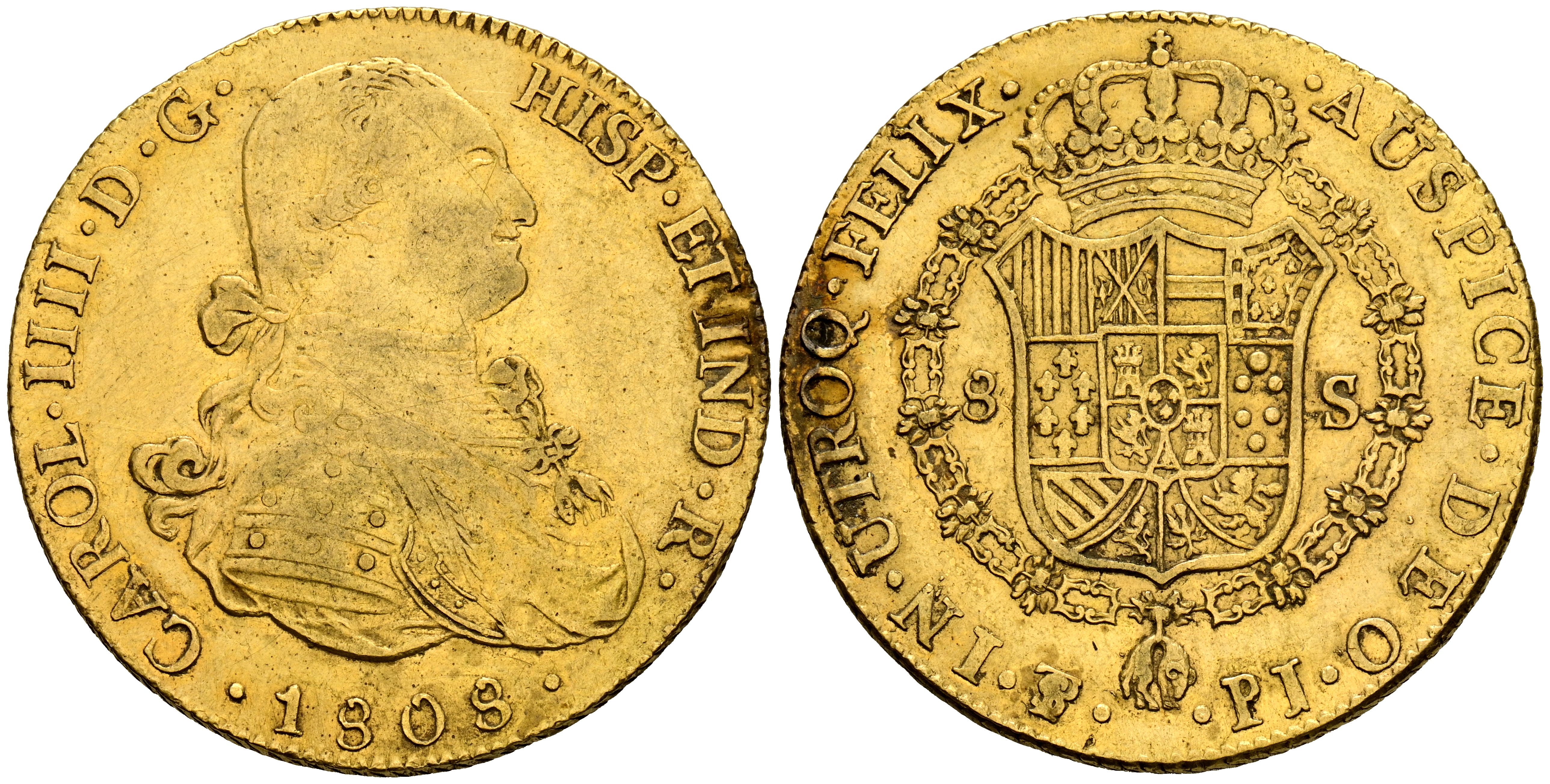 CARLOS IV (1788-1808). 8 Escudos. (Au. 27,01g/38mm). 1808. Potosí PJ. (Cal-2019-1714). MBC.