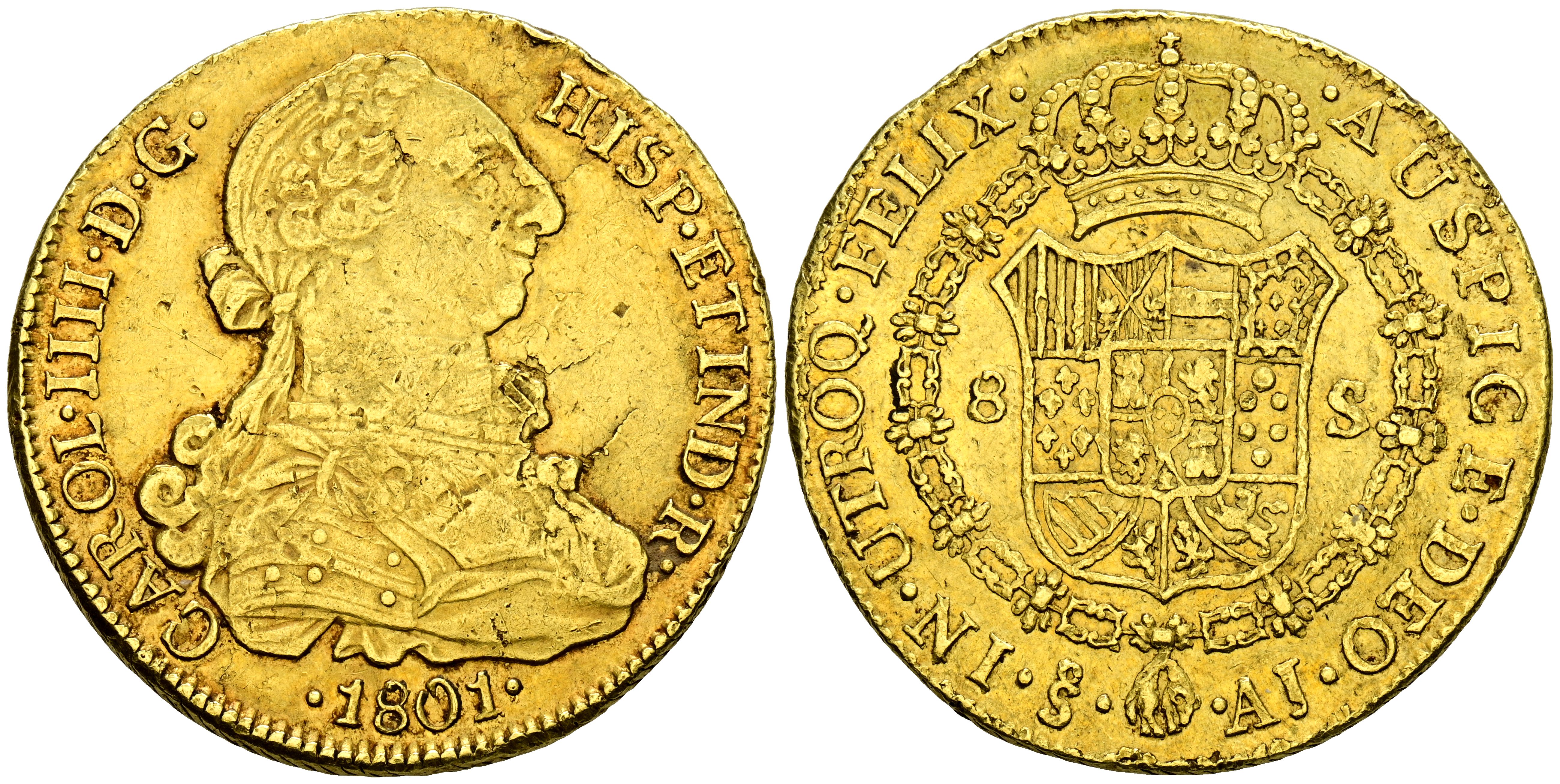 CARLOS IV (1788-1808). 8 Escudos. (Au. 27,00g/38mm). 1801. Santiago AJ. (Cal-2019-1769). MBC-. Hojitas.