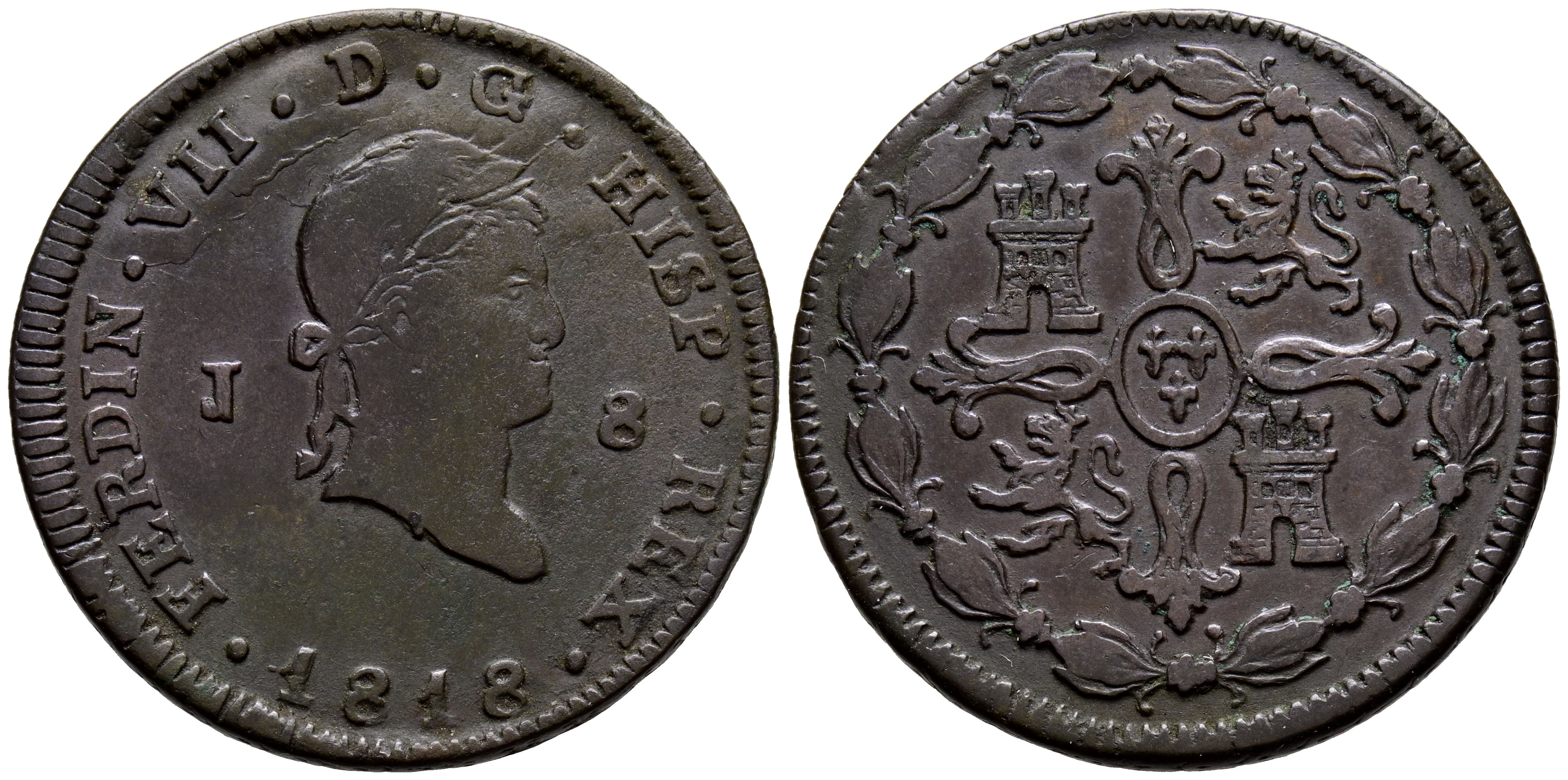 FERNANDO VII (1808-1833). 8 Maravedís. (Ae. 9,42g/30mm). 1818. Jubia. (Cal-2019-198). Busto laureado. MBC