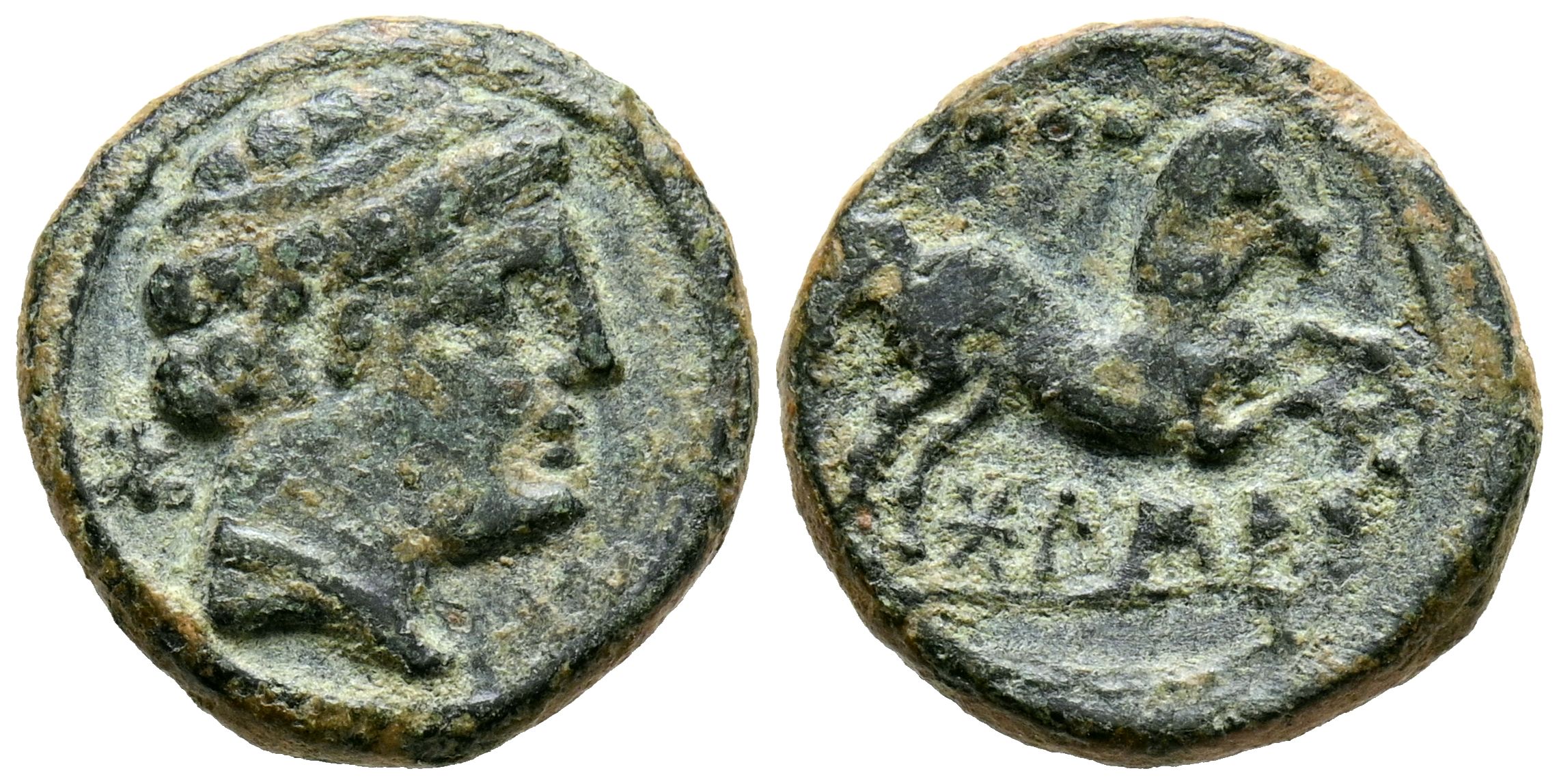 BOLSCAN (Huesca, Aragón). Cuadrante. (Ae. 3,02g/16mm). 180-20 a.C. (FAB-1922). Anv: Cabeza diademada a derecha, detrás letra ibérica Bo. Rev: Caballo saltando a derecha, encima tres puntos y debajo leyenda ibérica: BoLSCaN. MBC.
